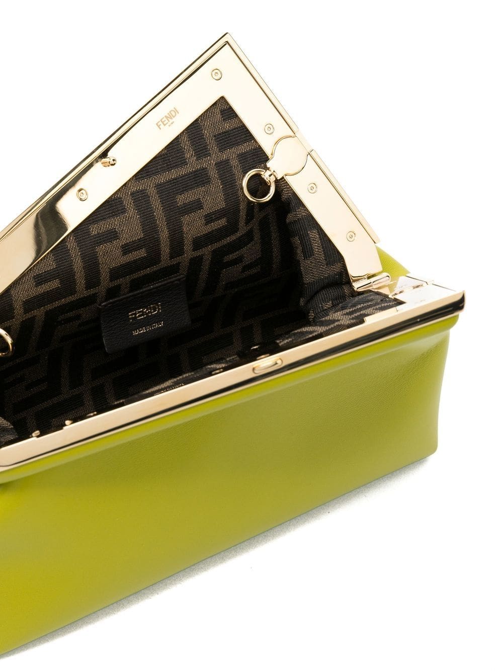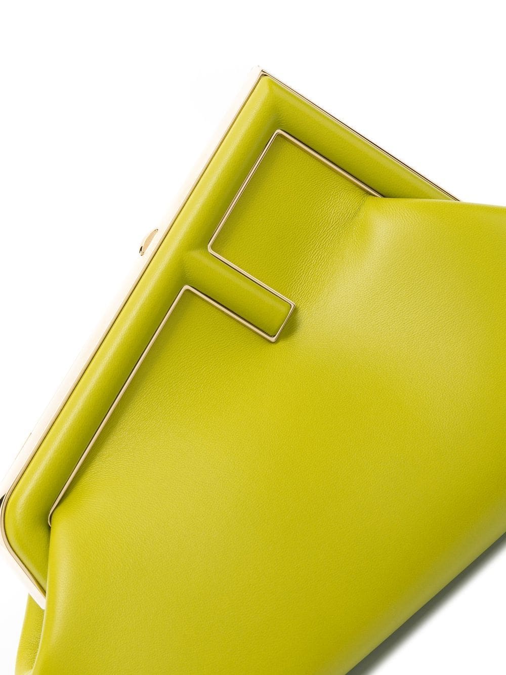 Defined by its exaggerated F-shaped clasp fastening, a nod to the house's penchant for logomania, this acid-green iteration of the First clutch is made in Italy from smooth calf leather and lined with Fendi's iconic FF print.