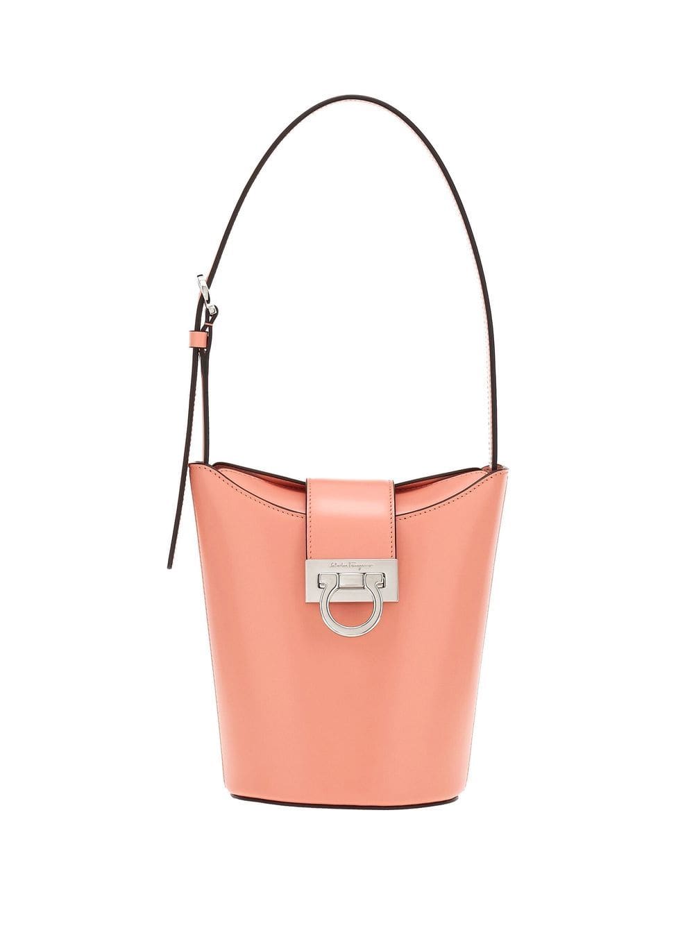 Ferragamo combines features from the bucket bag and the shoulder bag to create this hybrid silhouette. The design remains faithful to the geometric rules of the Trifolio collection, with its impeccably crafted structured shape. Functionality is fused with style in the way the Gancini flip-lock fastening reveals a lip closure at the top.
