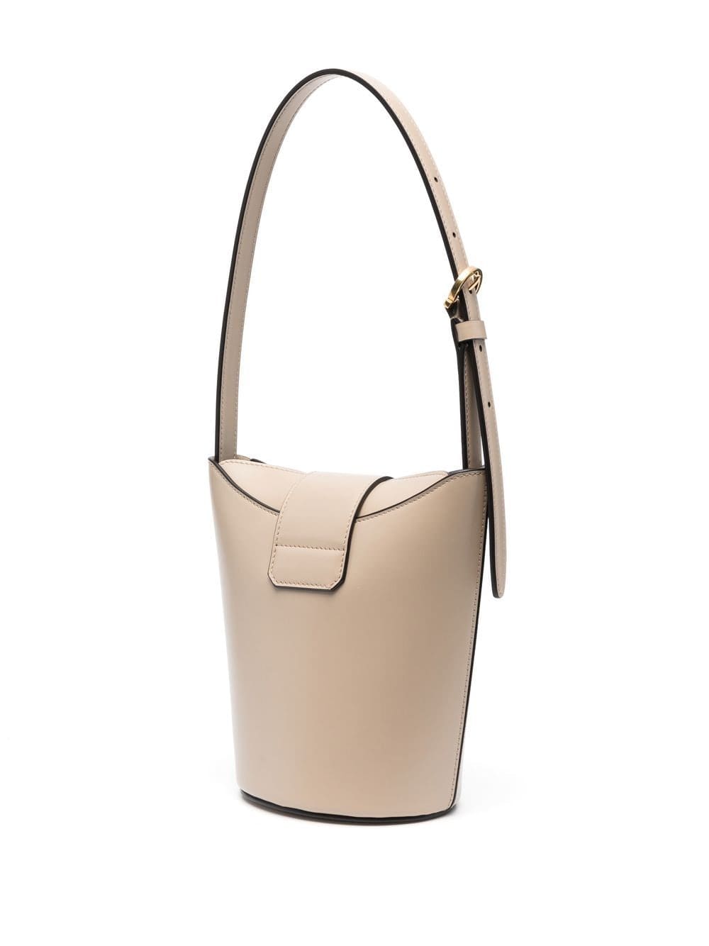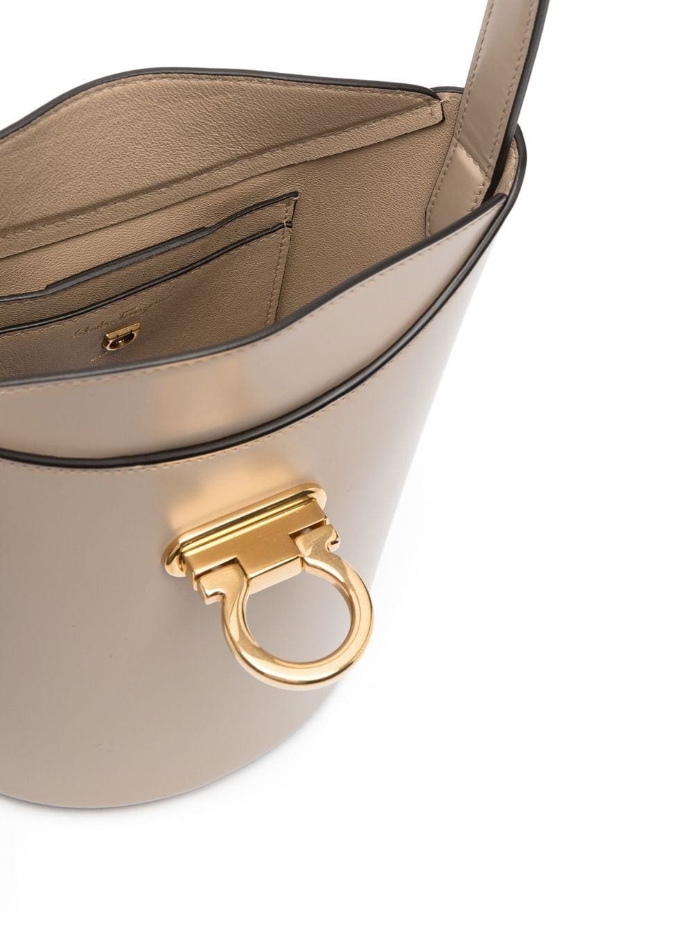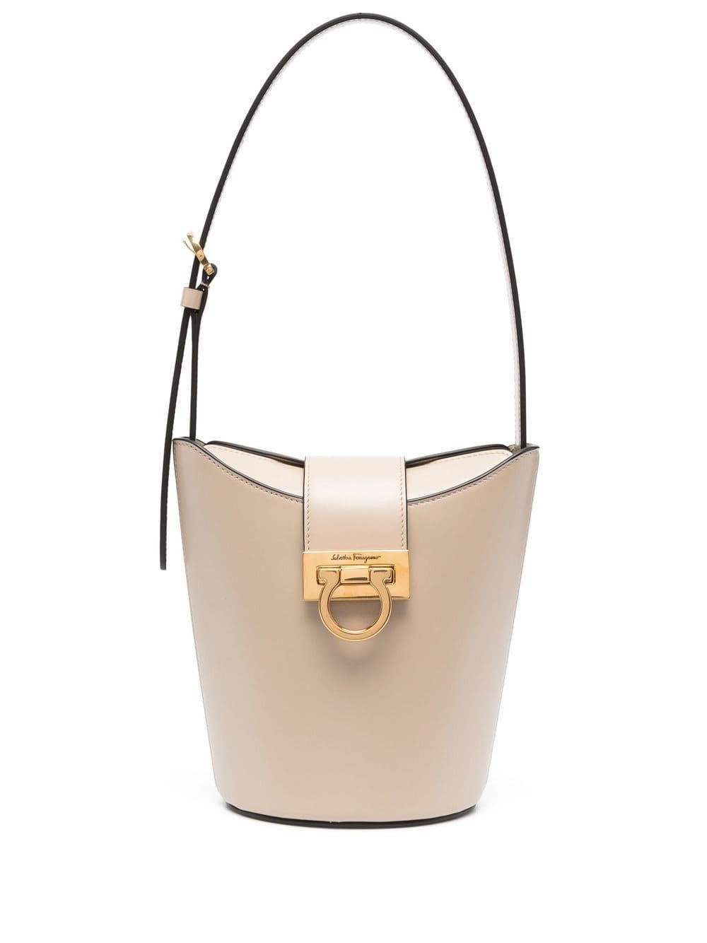 An hybrid of the bucket and shoulder bag, this small structured silhouette from Ferragamo's SS23 collection is crafted from smooth calf leather in Italy and designed in a versatile and understated beige colour. The house's iconic Gancini plaque takes centre stage as a flip-lock fastening.