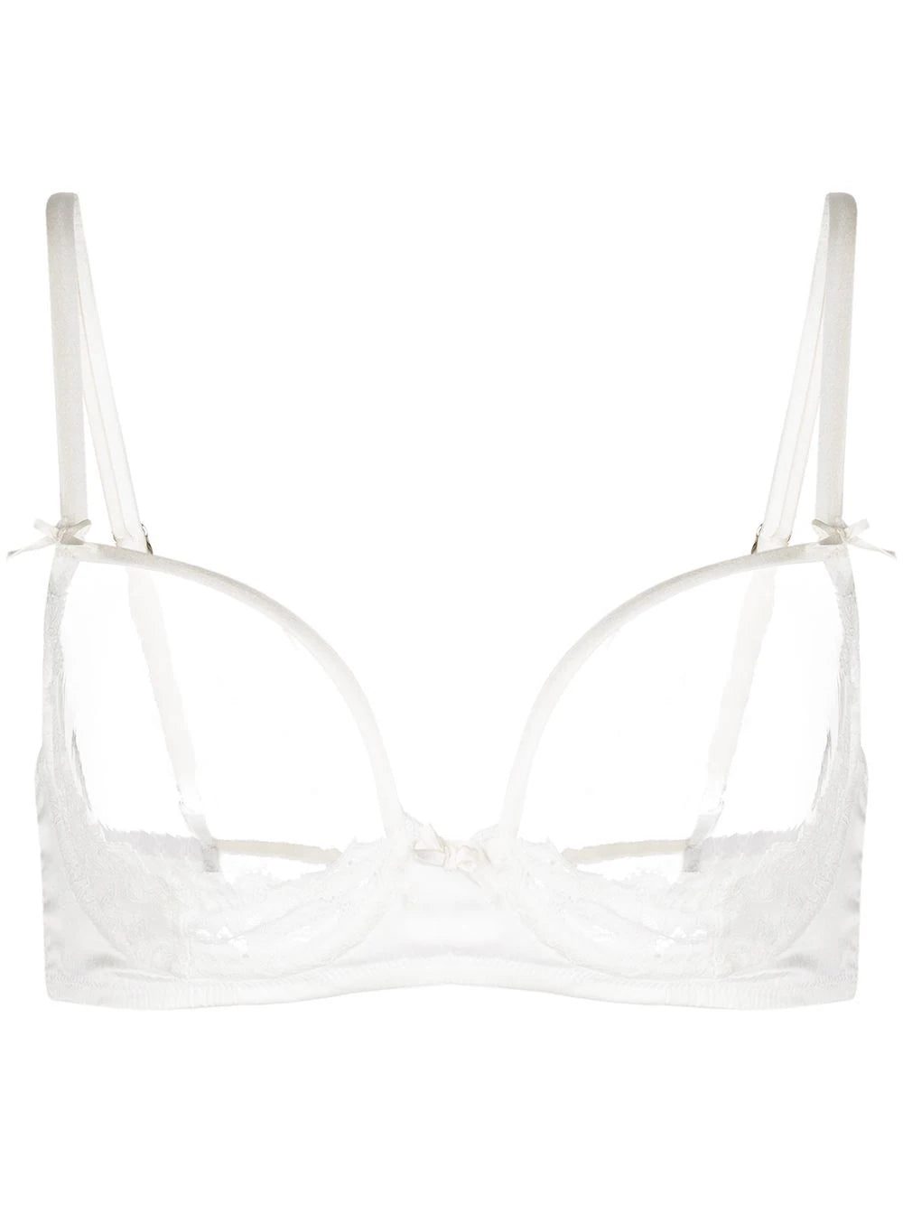 white open cup rear hook and eye fastening underwire cup lace detailing Just a reminder that this piece must be tried on over your own garments.