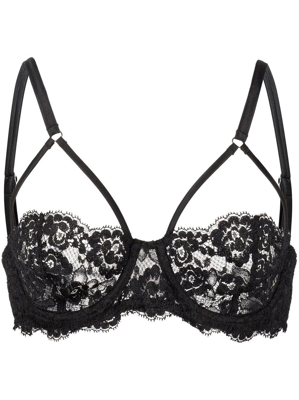 black half cup floral-lace detailing embroidered design sheer panelling rear hook fastening Just a reminder that this piece must be tried on over your own garments.