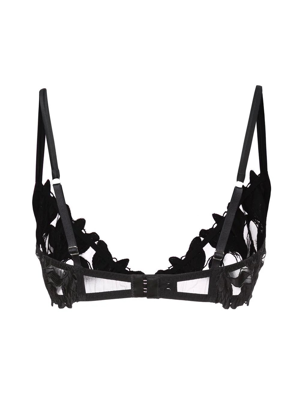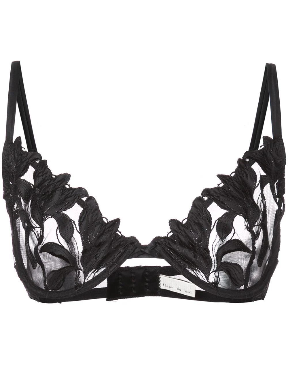 Black Lily Lace Plunge Demi bra from Fleur du Mal featuring adjustable straps, floral appliqués and a hook & eye fastening. Underwear and lingerie must be tried on over your own garments.