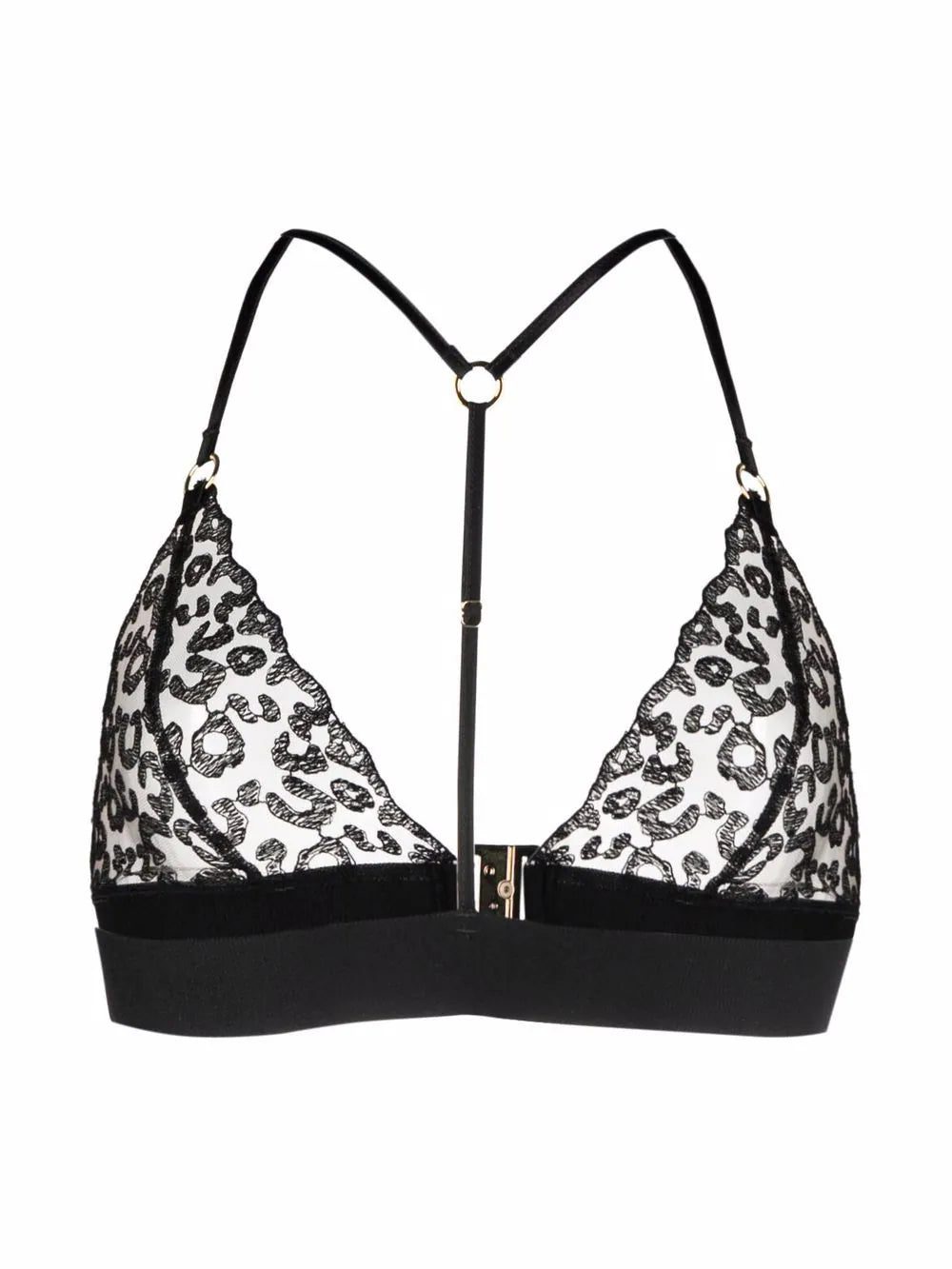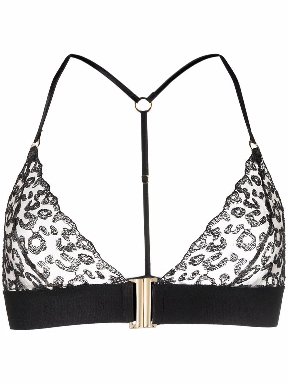 black pattern-lace detailing semi-sheer construction triangle cup halterneck hook fastening Just a reminder that this piece must be tried on over your own garments.