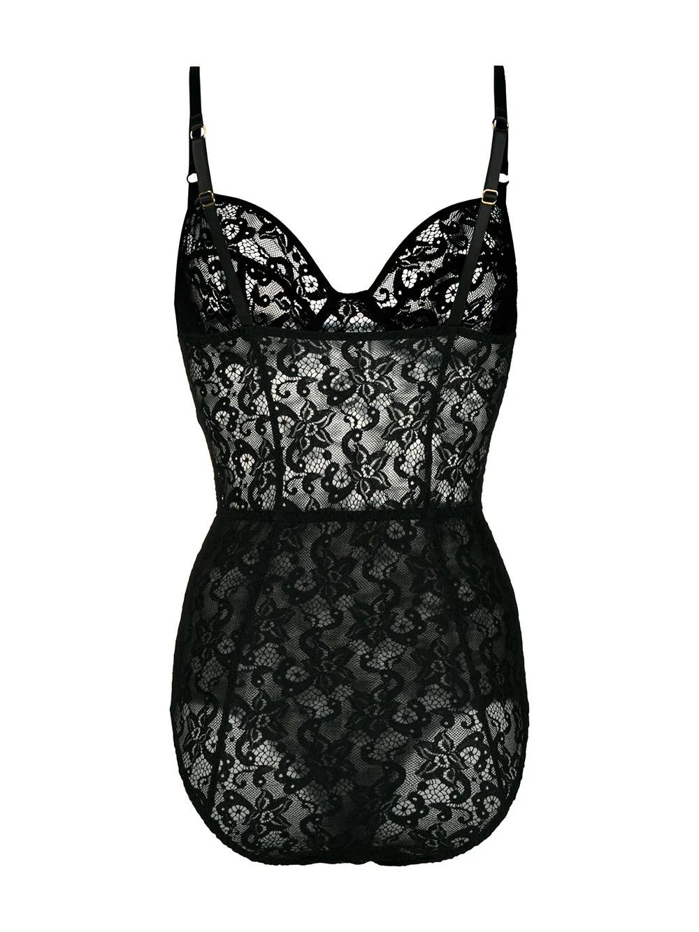 Black Emilia lace bodysuit from Gilda & Pearl featuring a sheer construction, adjustable shoulder straps and underwired cups. It is essential that you try underwear and lingerie over your own garments. We trust you to follow the rules. POSITIVELY CONSCIOUS: Gilda & Pearl scores 3 out 5 by independent ethical brand rating agency Good On You. It has a good animal rating and does not use fur, leather, wool, down, exotic animal skin or angora. It traces most of its supply chain manufactures locally to reduce its carbon footprint.
