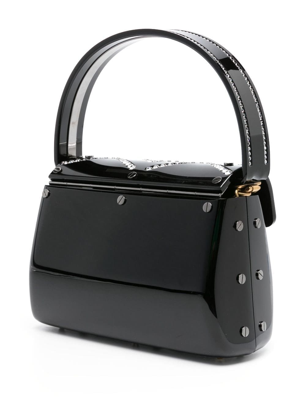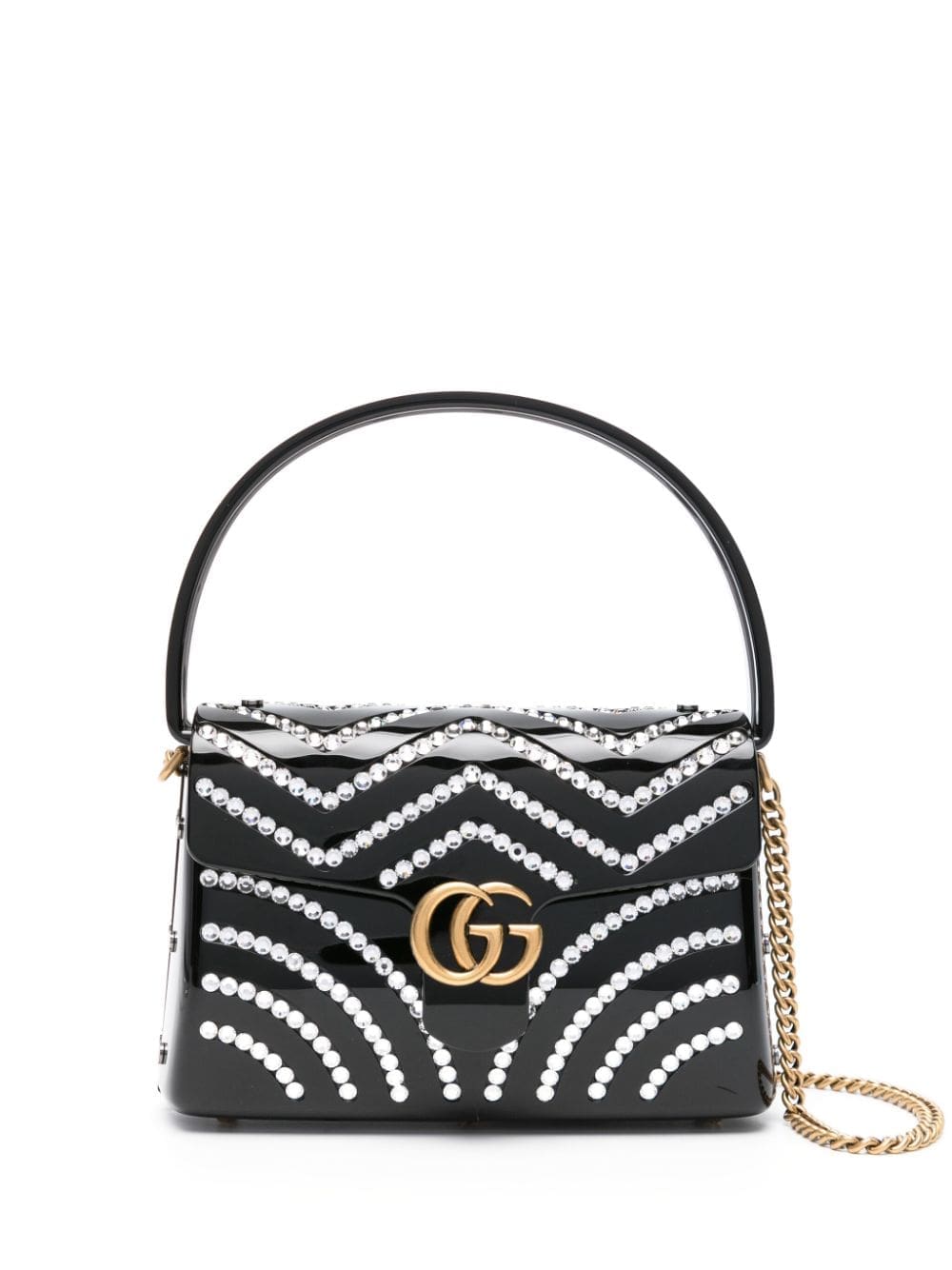 A sartorial ode to the glistening lights of Broadway, this glossy black Gucci bag is traced with crystals that mimic the look of marquee signs. It’s crafted to a structural silhouette with a gold-tone Double GG plaque and exposed screws for industrial juxtaposition.