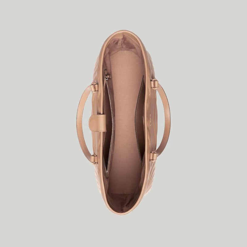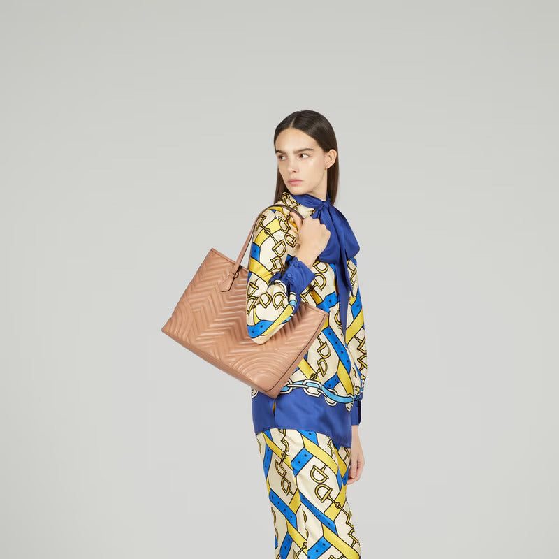 With its recognizable matelassé fabric and Double G hardware, the GG Marmont has become synonymous with the House. Continuously reinvented through the seasons, new shapes are introduced within this signature line, matching Gucci's contemporary vision. This large tote bag reveals a chevron base, further enhancing the tonal logo hardware.