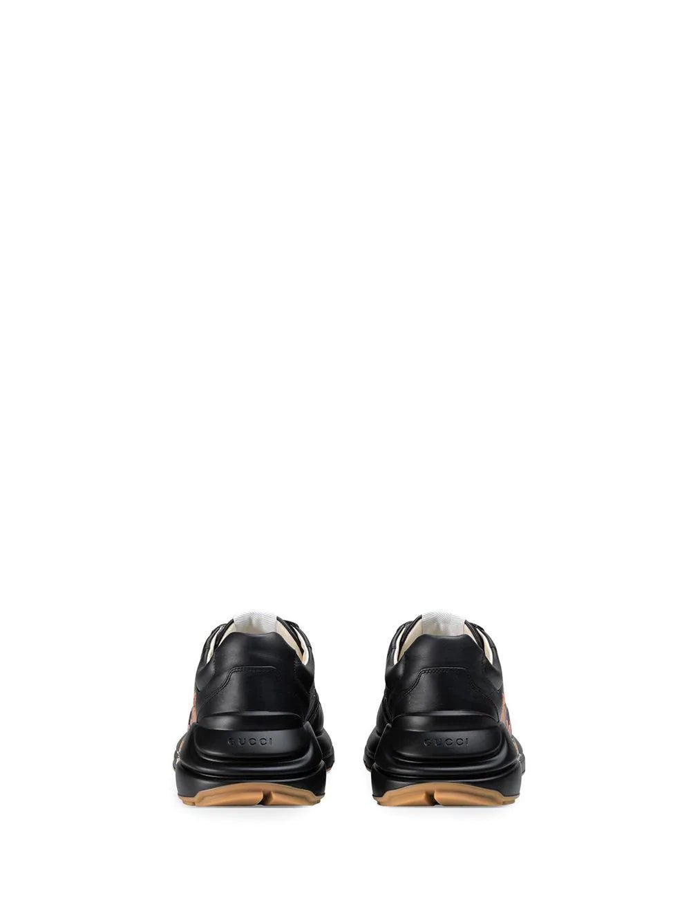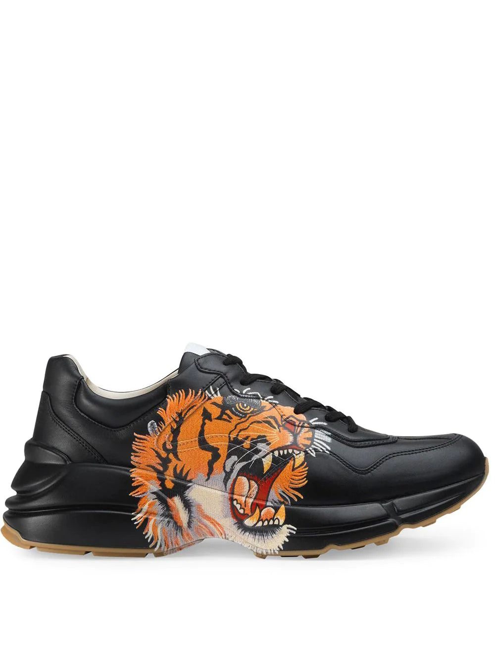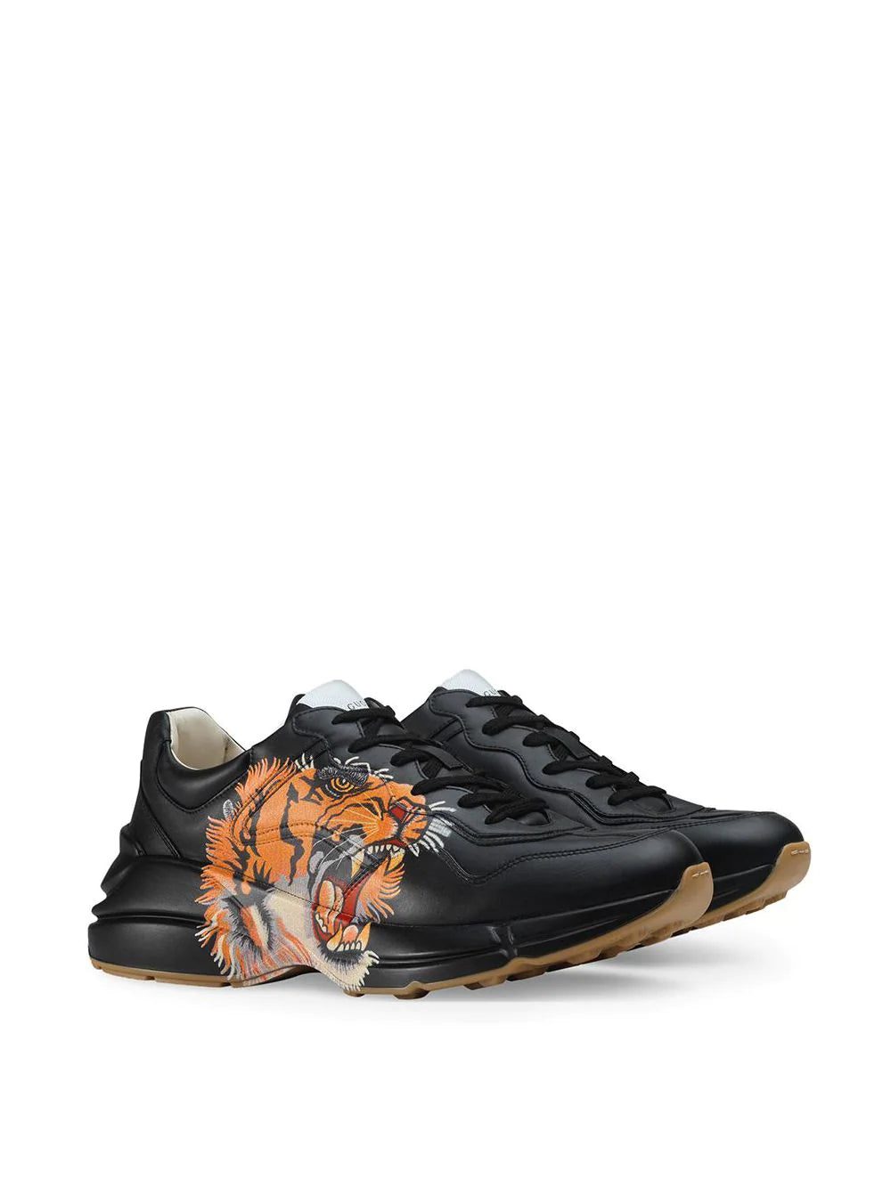 The chunky sneaker has a retro influence in leather with the roaring tiger head, specially printed to create a three-dimensional effect that references the embroideries found throughout the collection. Black leather; Tiger print; Debossed Gucci logo at the back sole; Men's; Rubber sole; 6cm height; Made in Italy.
