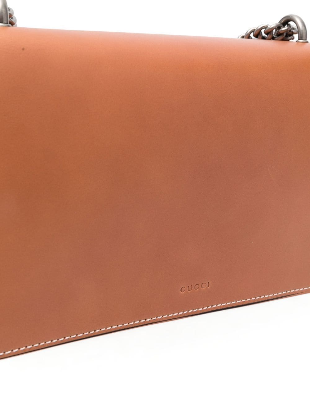 Dionysus shoulder bag from GUCCI featuring brown, leather, decorative plaque, foldover top, main compartment and chain-link shoulder strap.