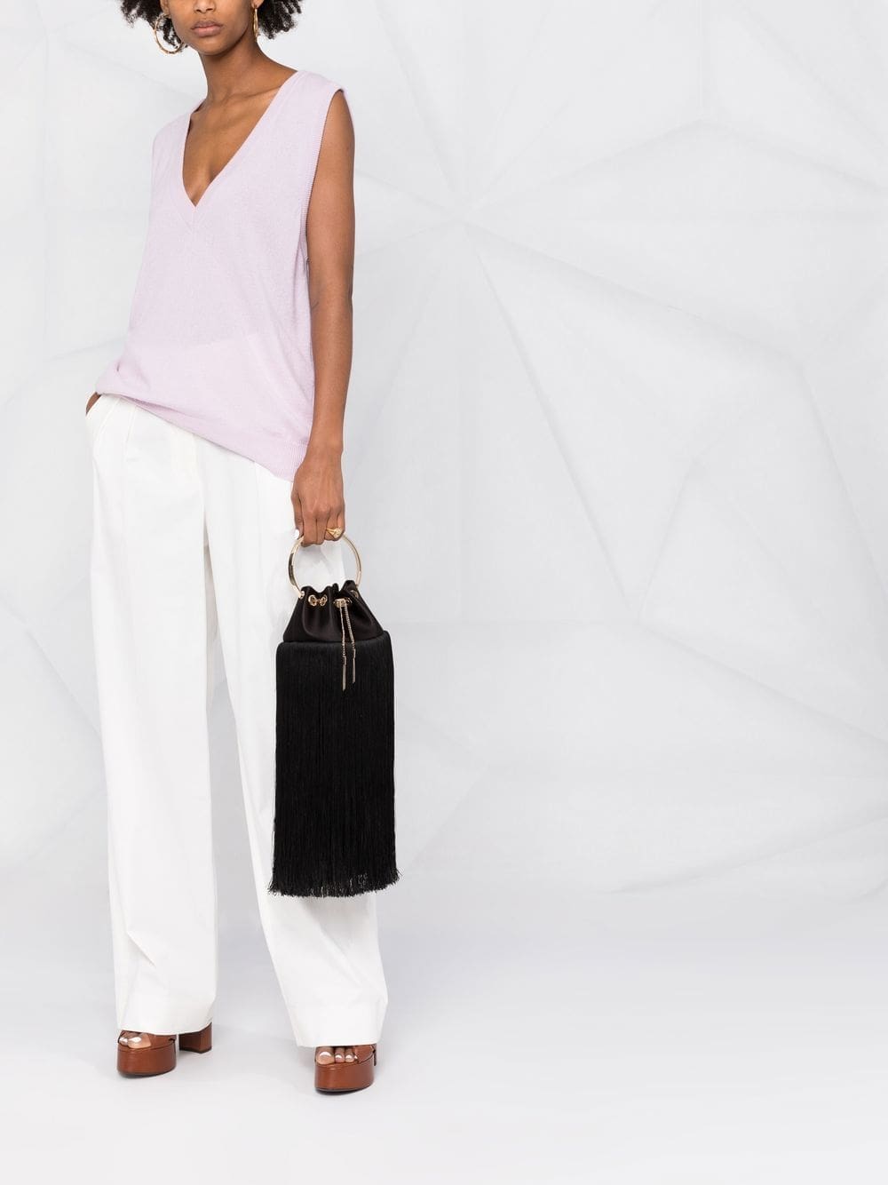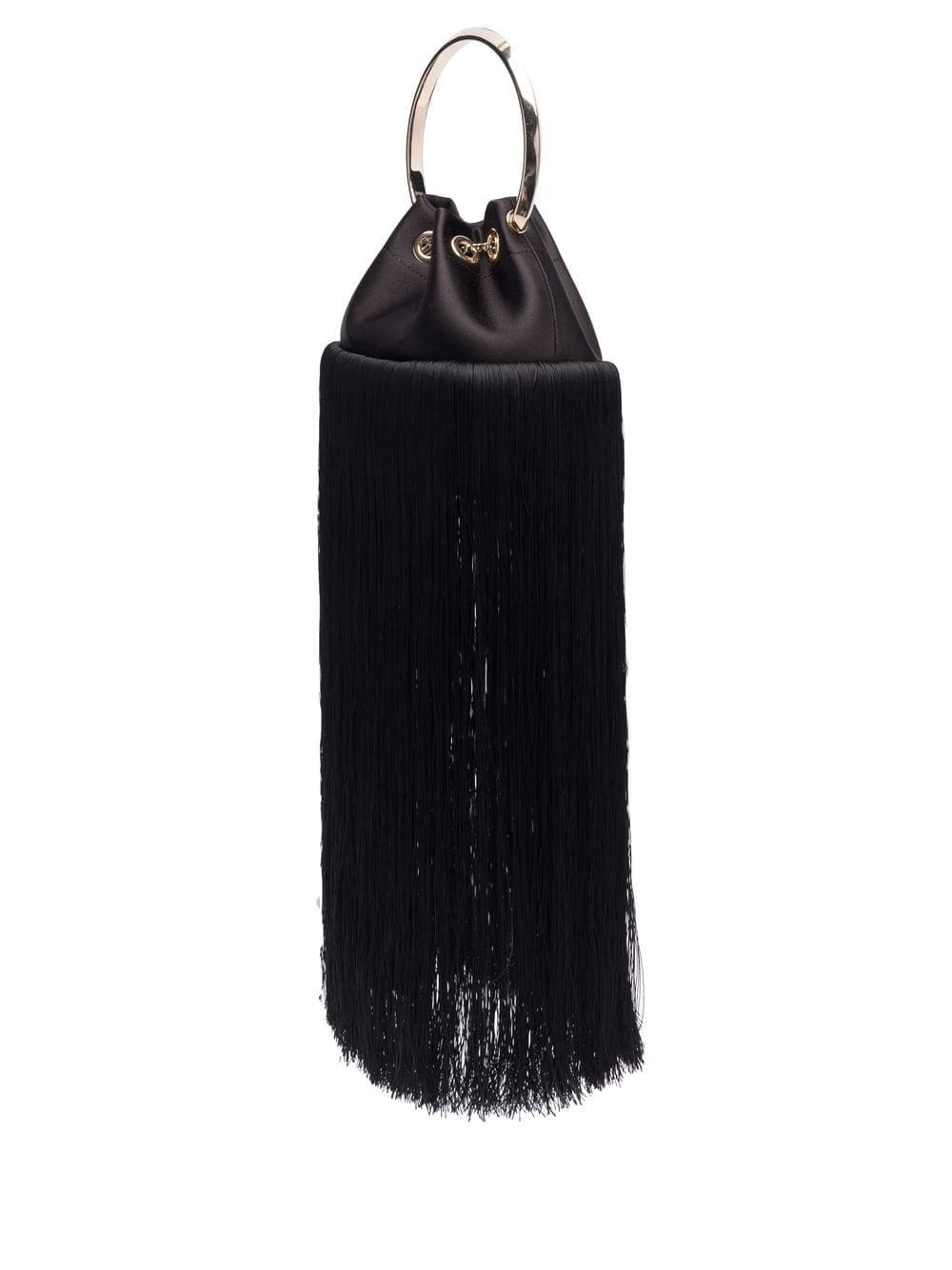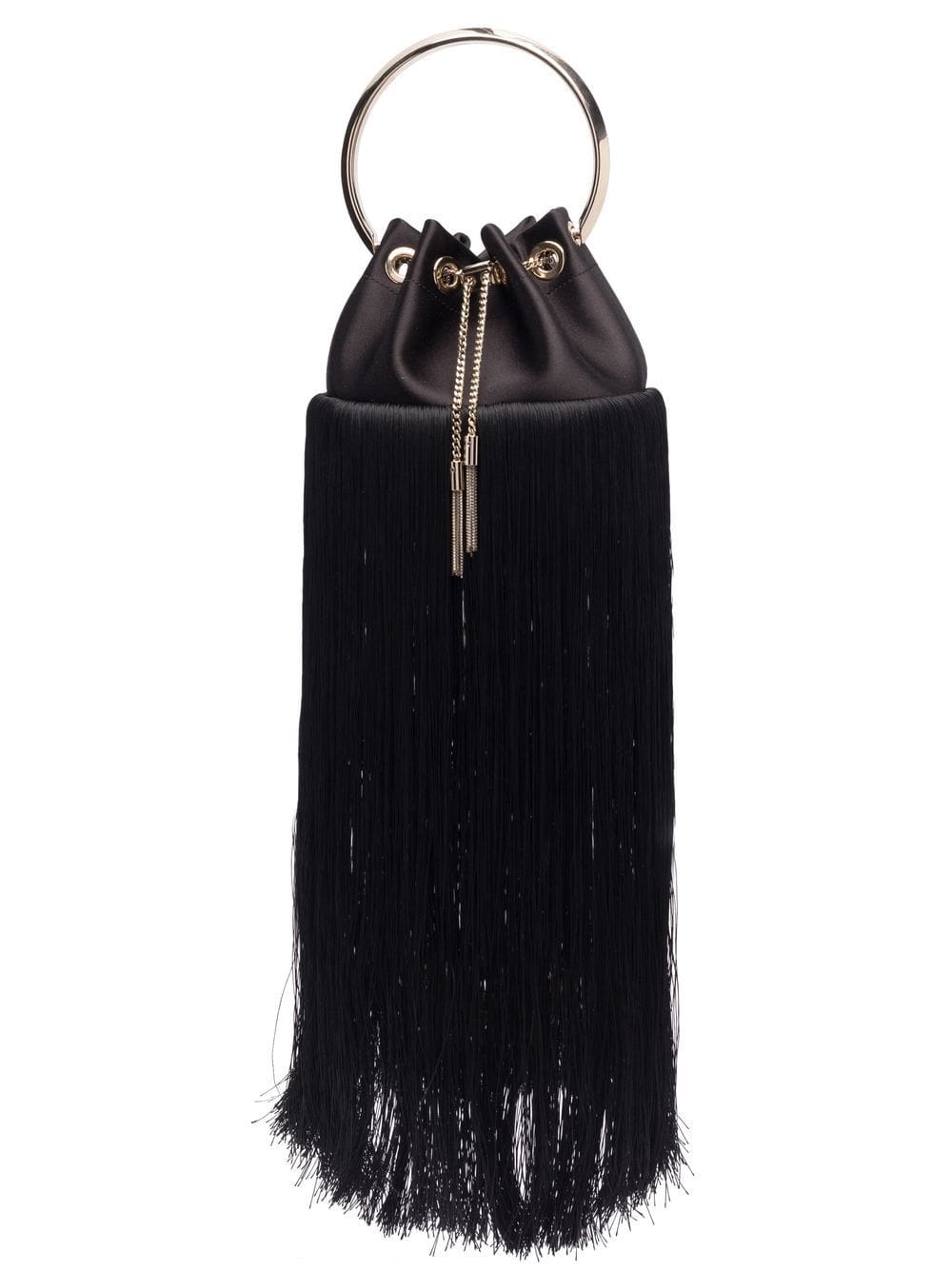 An iconic style designed by Jimmy Choo, the Bon Bon bag is mainly defined by its bucket design and circular top handle. Arriving in black satin, this iteration stands out with a striking fringed edge.