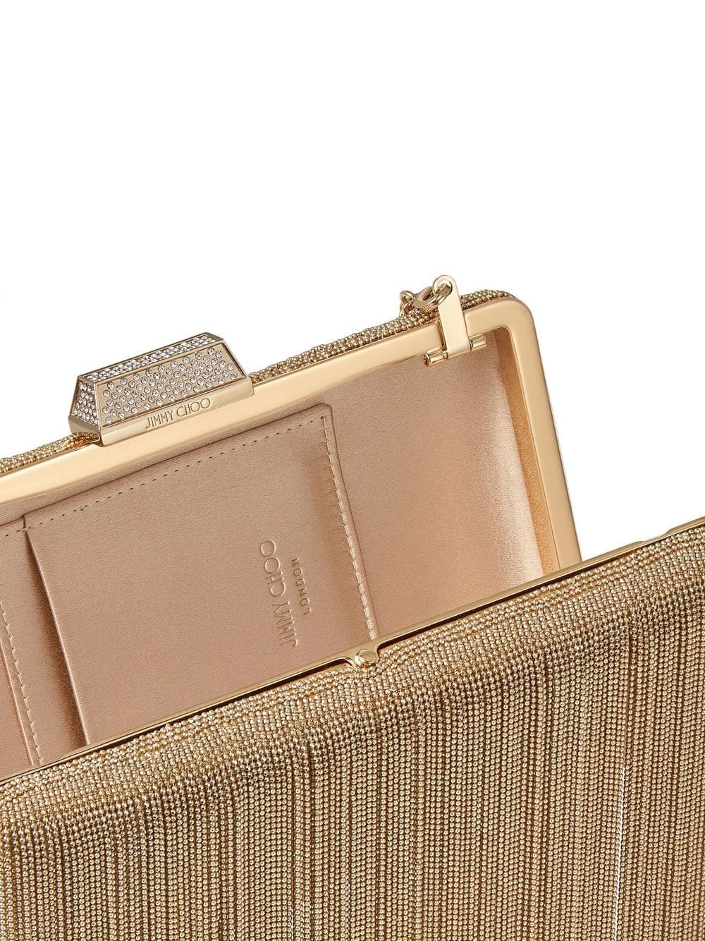 Jimmy Choo is synonymous with high-octane glamour, echoed in the design of this clutch bag. It's adorned with chain fringe and a crystal-embellished clasp fastening.
