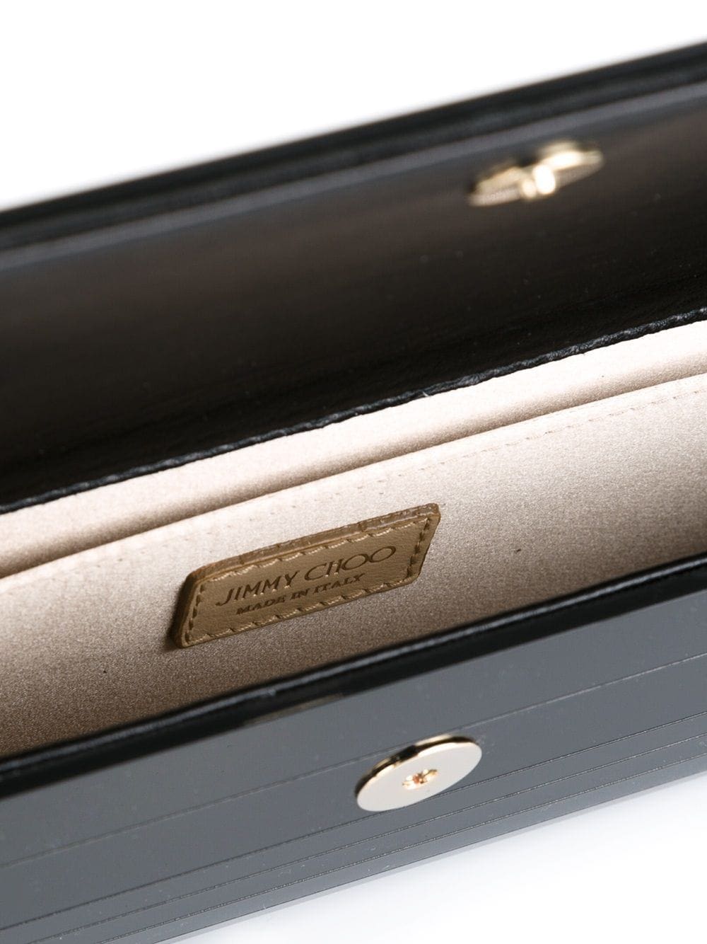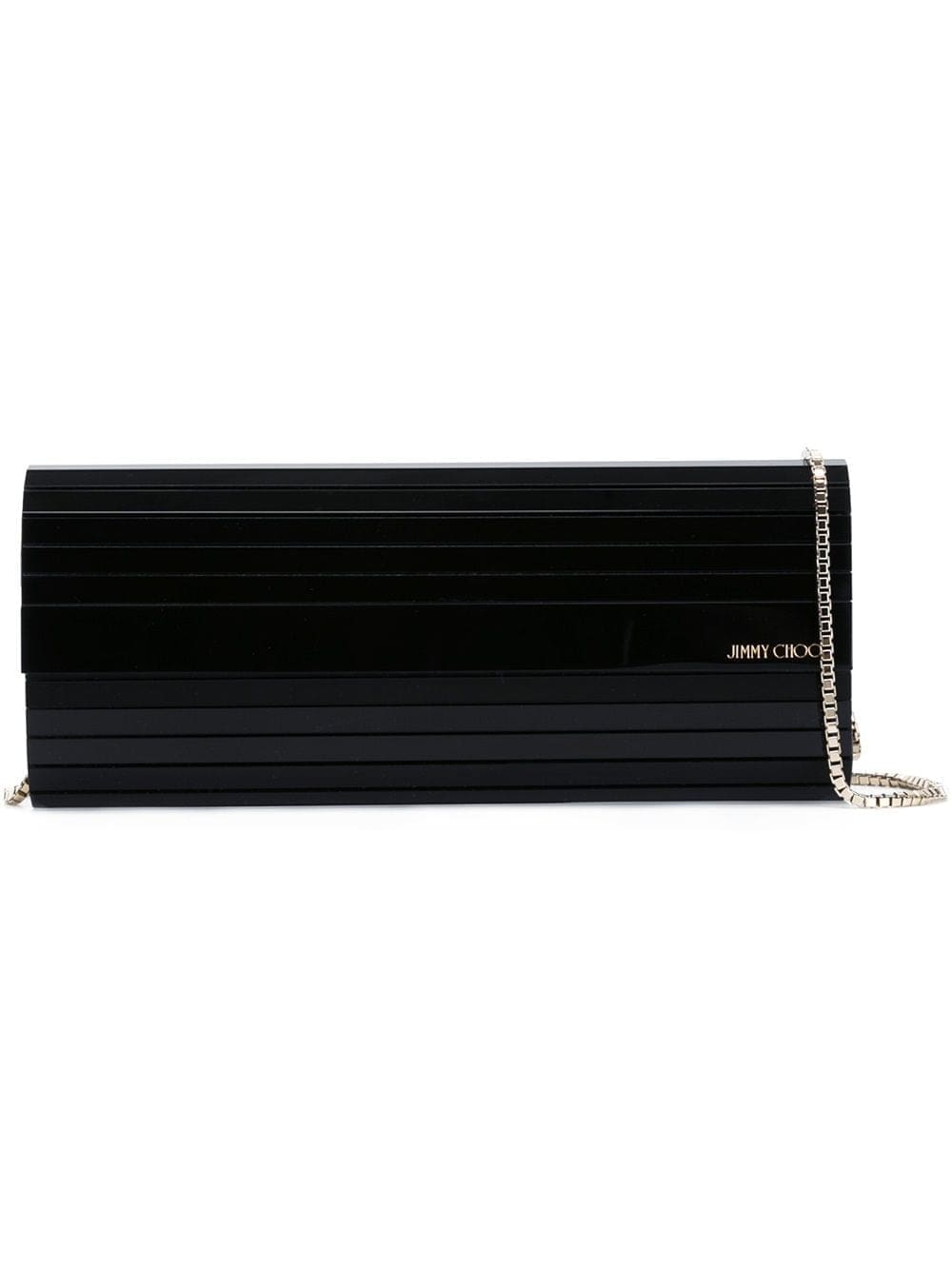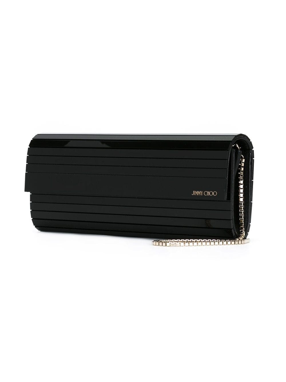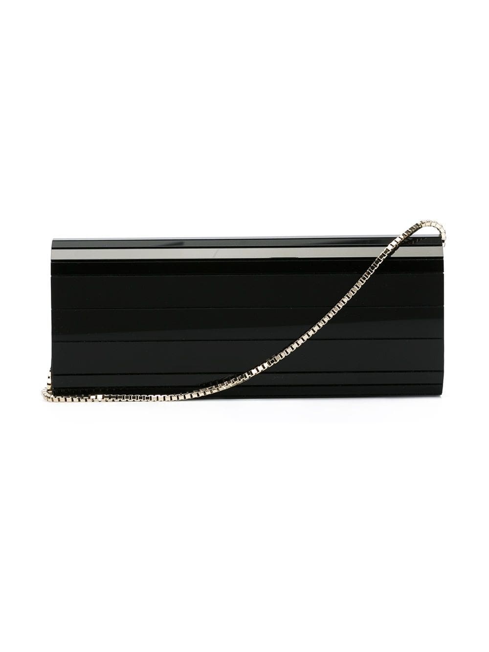 All good things come in rectangles - bourbon biscuits, pillows, banana bread, shoe boxes....oh and, of course, this Sweetie clutch from Jimmy Choo. In a deep black hue with sleek panelled detailing, this piece holds all your essentials and more. Including, but not limited to, a packet of bourbon biscuits. Featuring a foldover top with magnetic closure, an internal slip pocket, an internal logo patch and a chain strap.