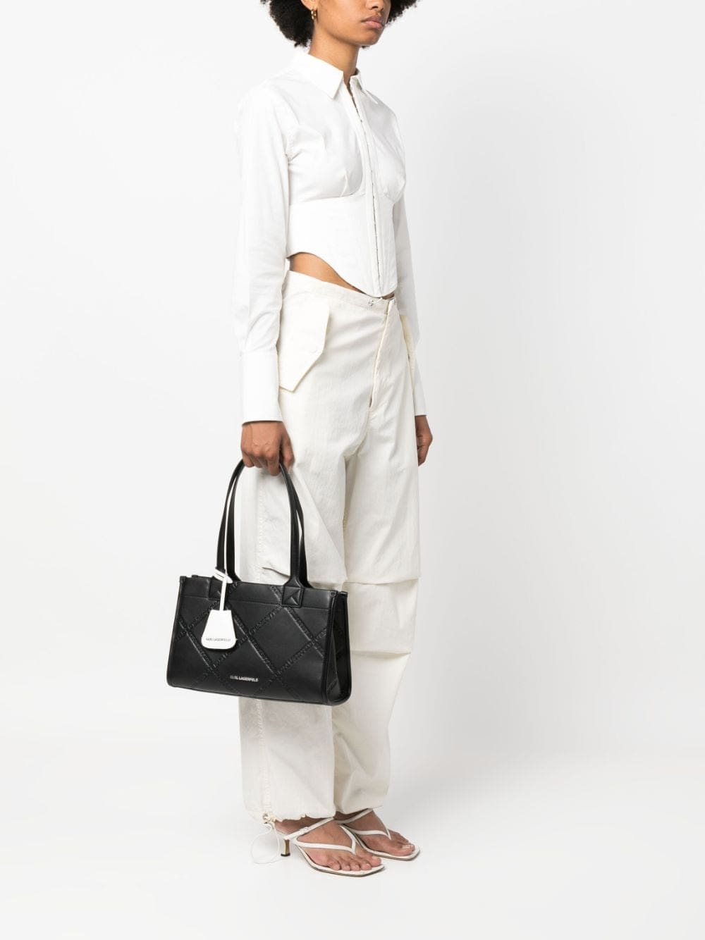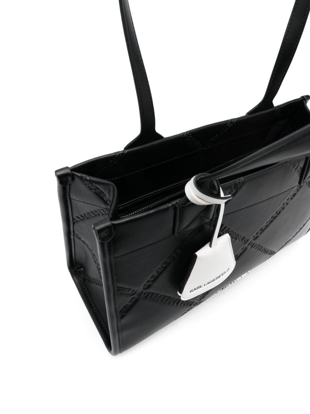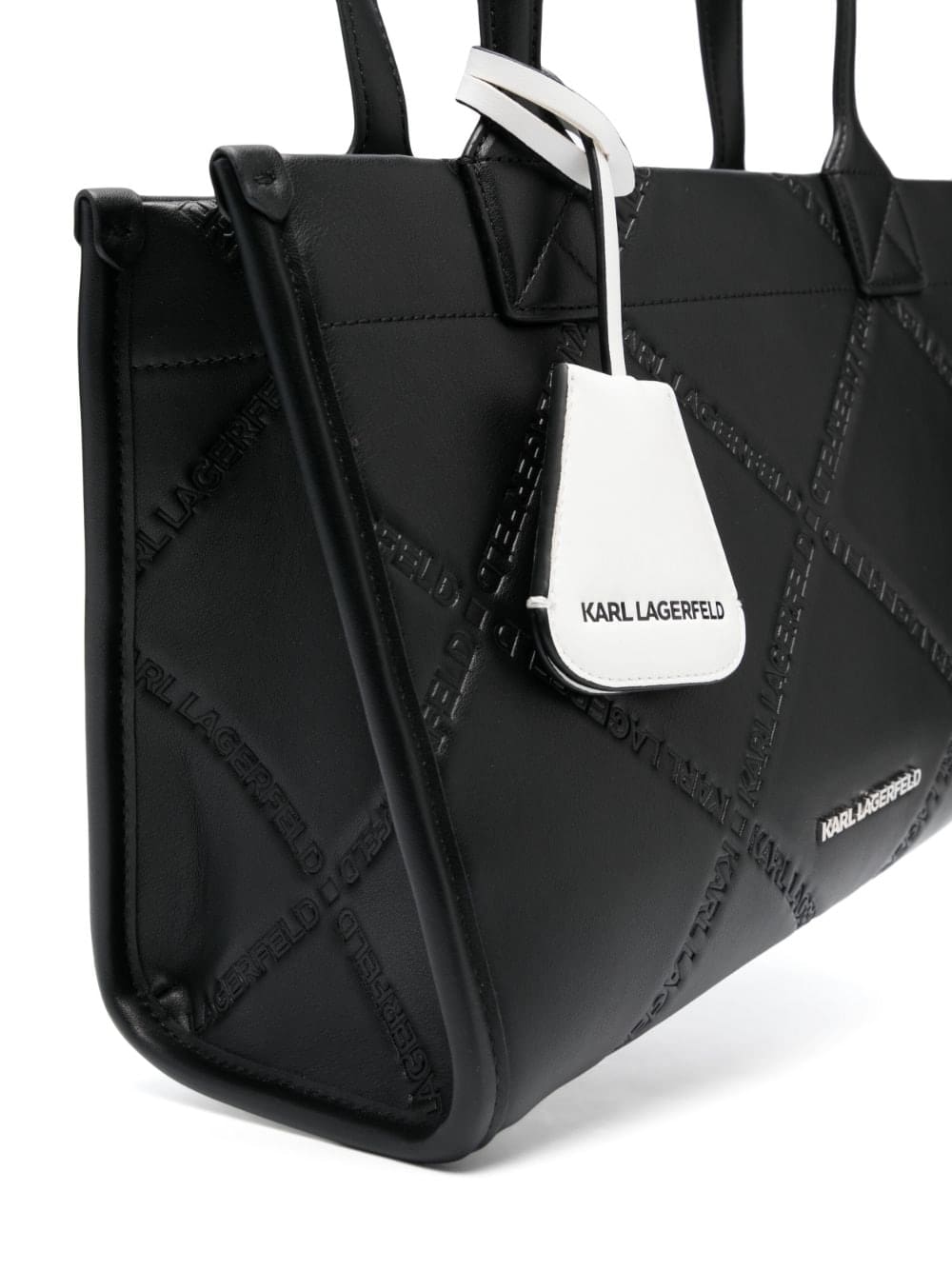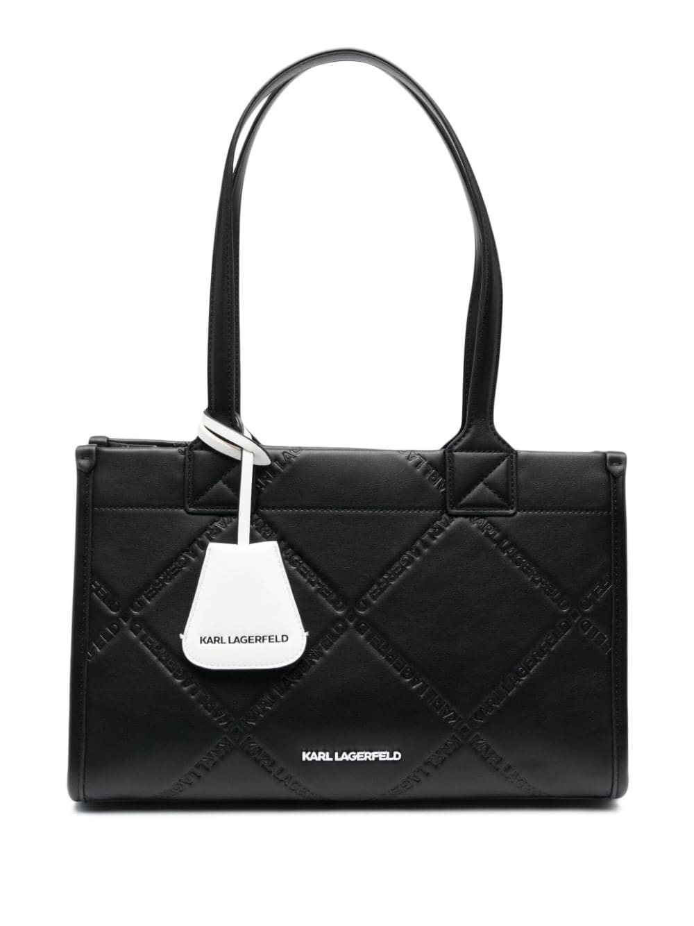 medium K/Skuare tote bag from Karl Lagerfeld featuring black, faux leather, geometric panelled design, all-over debossed logo print, embossed logo to the front, logo tag, open top, two long top handles, internal slip pocket and main compartment.