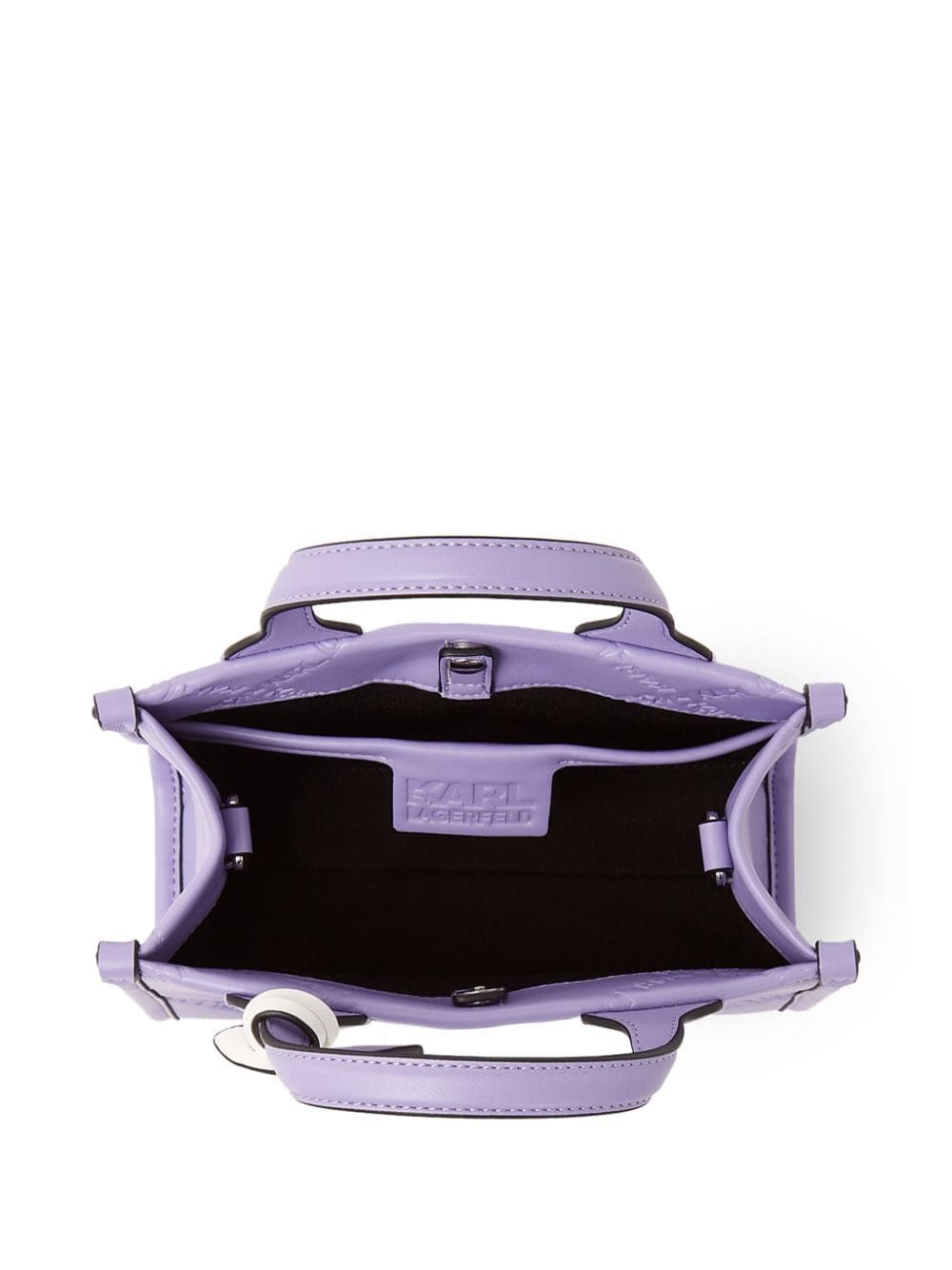 Karl Lagerfeld presents this small K/Skuare tote bag in a mood-boosting purple hue. Its butter-soft calf leather silhouette is stamped with the brand's moniker in a striking crisscross effect that resembles diamond quilting, while its two top handles and optional shoulder strap make for a versatile piece.