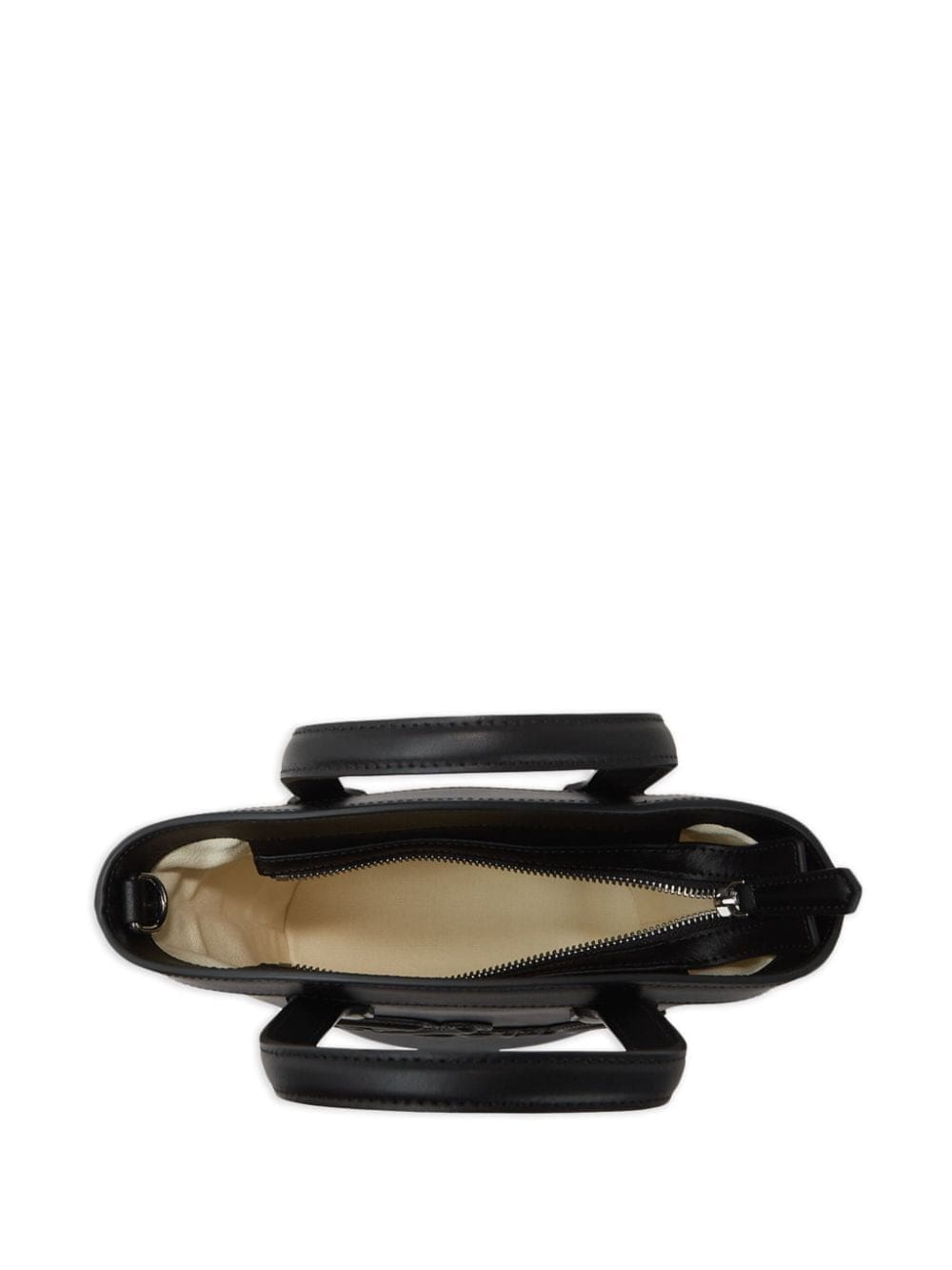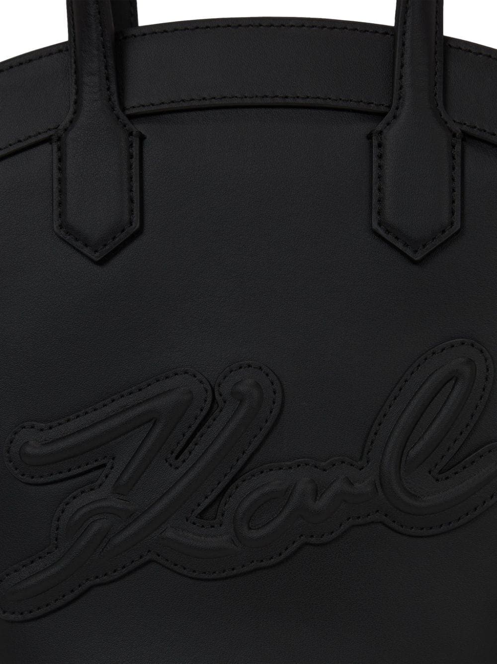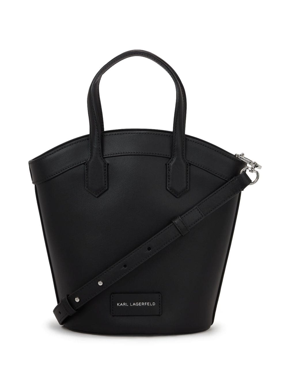 Karl Lagerfeld's K/Signature Tulip tote bag is crafted from smooth calf leather in black and features a compact bucket silhouette. It's equipped with two top handles, an optional shoulder strap and is adorned with the brand's signature Karl script logo embossed on the front.