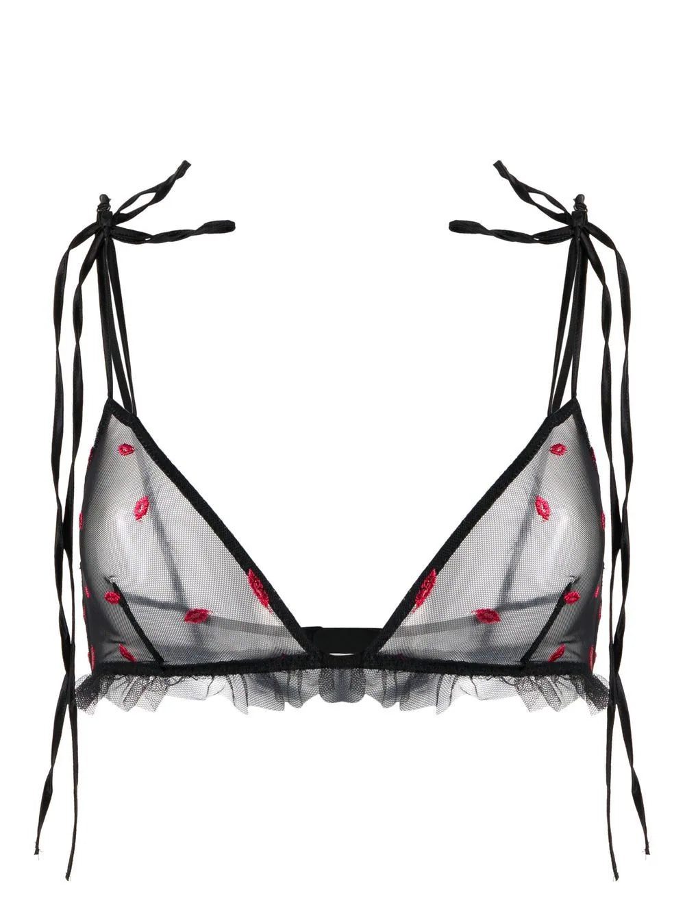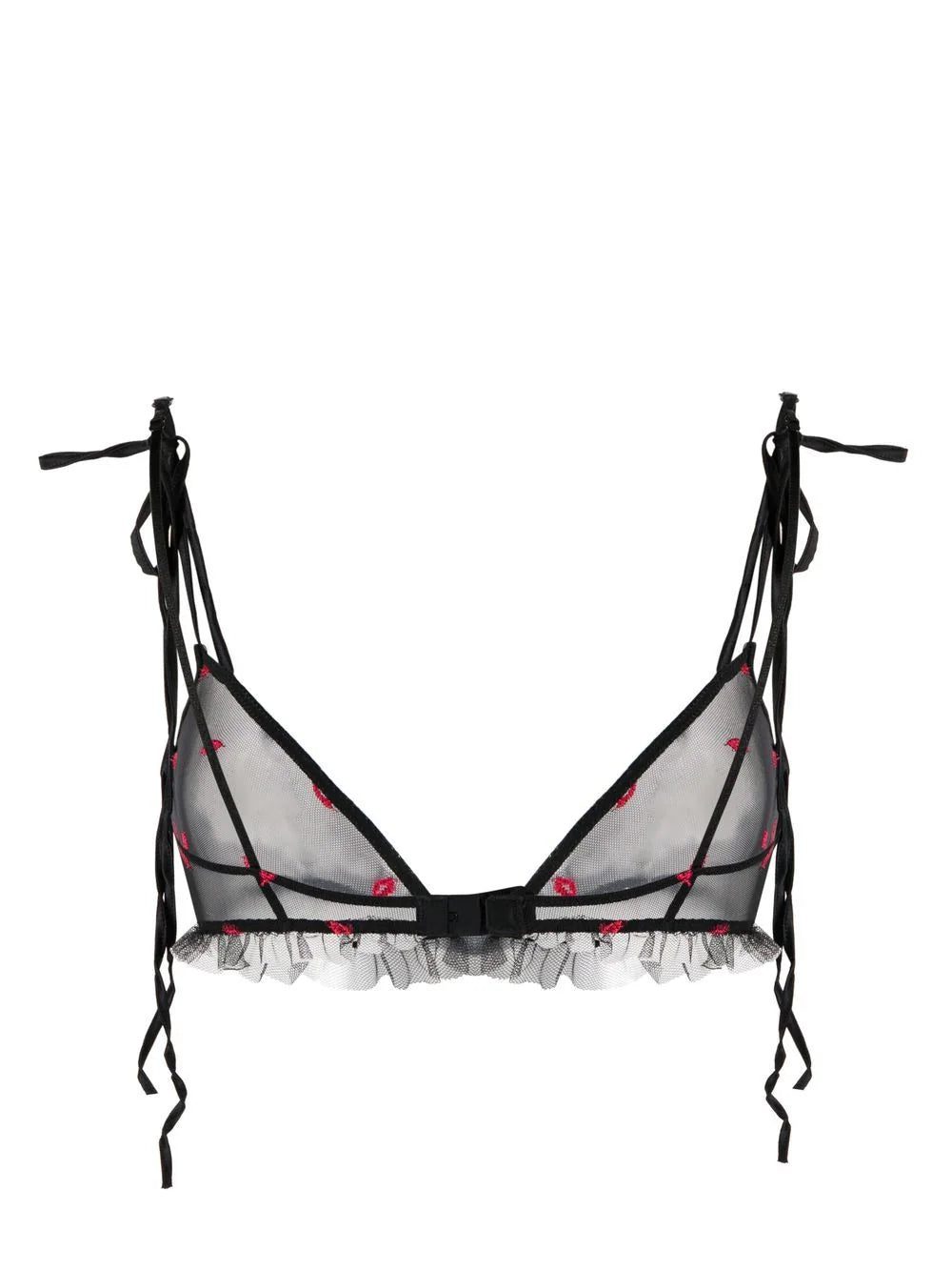 black embroidered motif ruffled detailing mesh panelling adjustable spaghetti straps hook and eye fastening