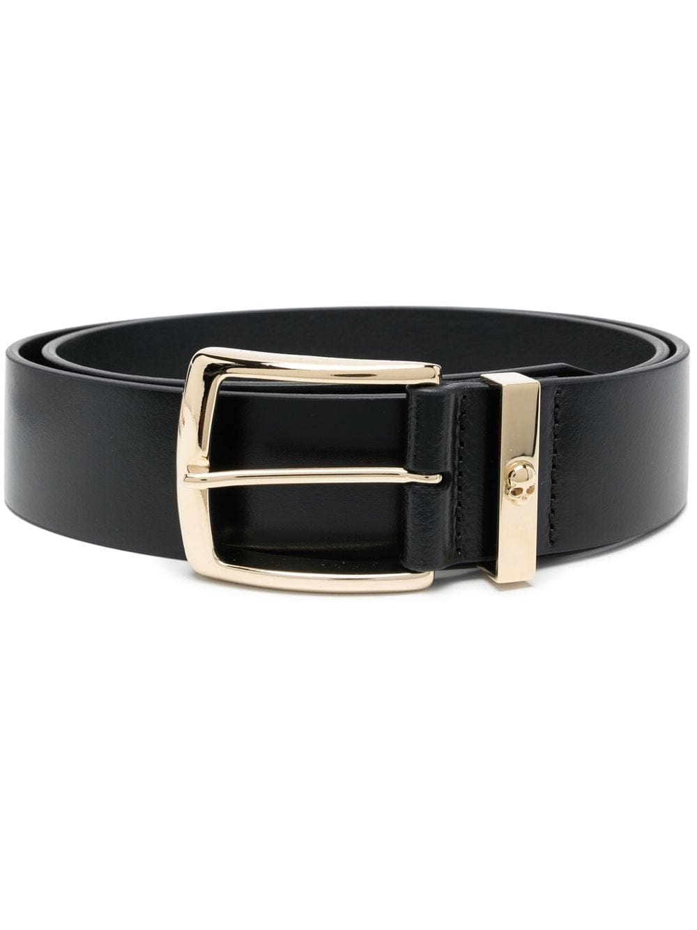 buckle-fastening leather belt from PHILIPP PLEIN featuring jet black, calf leather, buckle fastening, punched holes and gold-tone hardware.