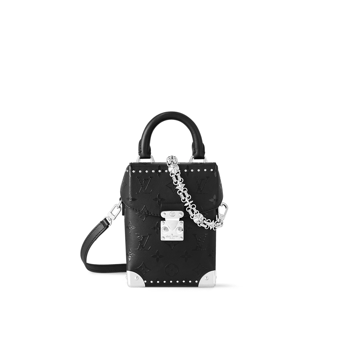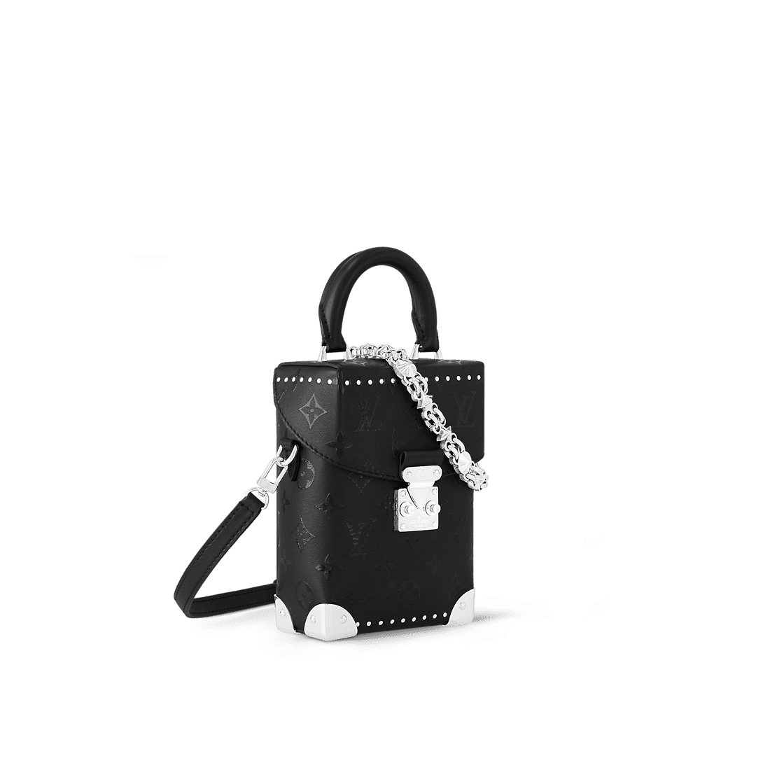 Nicolas Ghesquière’s distinctive Camera Box handbag is made from smooth calfskin, with a black Monogram print. The silver-color, gothic-inspired chain is made of Monogram Flower links, the blossoms reimagined with a rock-and-roll edge. In addition to the chain, there’s an articulated top handle and a detachable and adjustable leather strap.