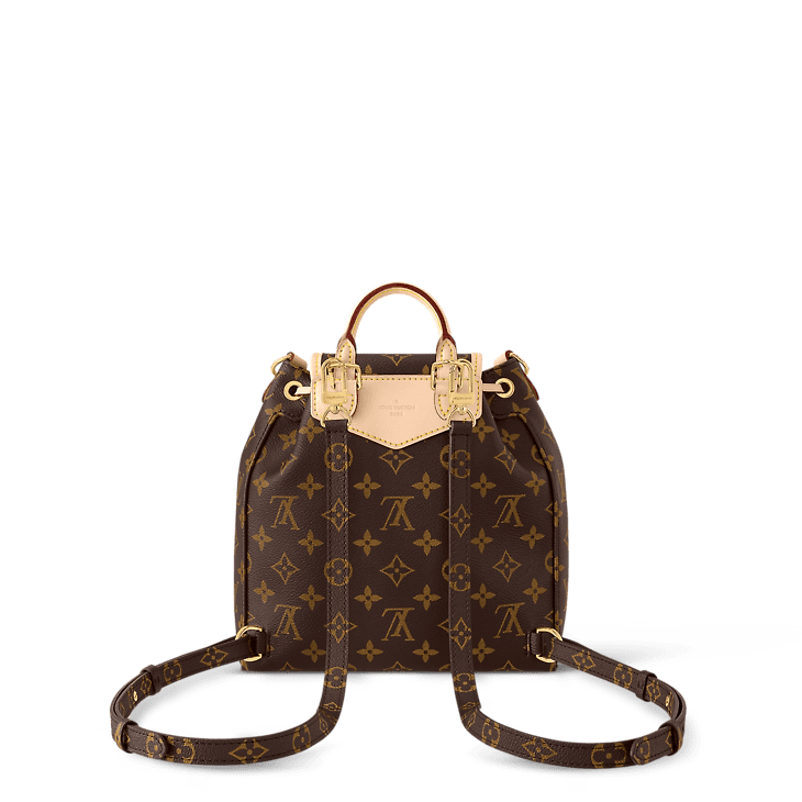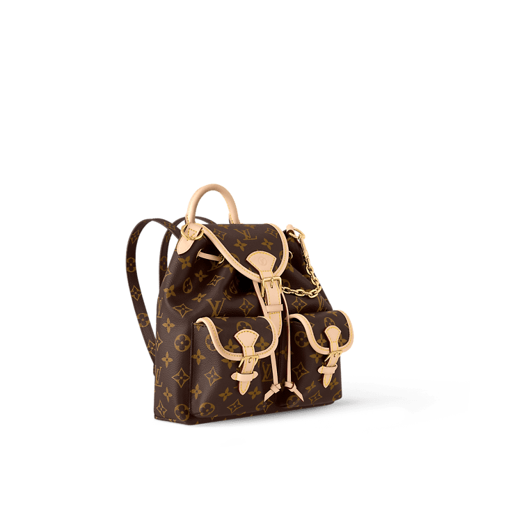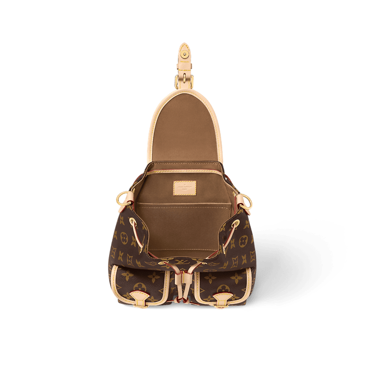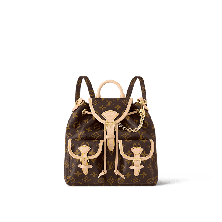 Made from Monogram canvas with leather trim, the super-cute, super-functional Excursion PM backpack has a design clearly influenced by the world of hiking. The main compartment closes with an adjustable sliding buckle and there are two pockets with buckles on the front. A gold-color chain, in addition to the top handle, enable different carries.