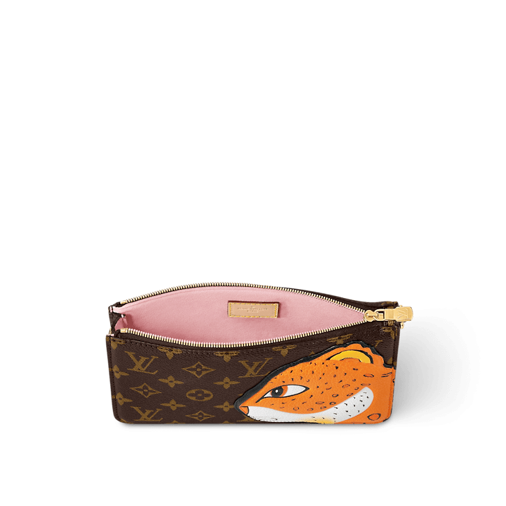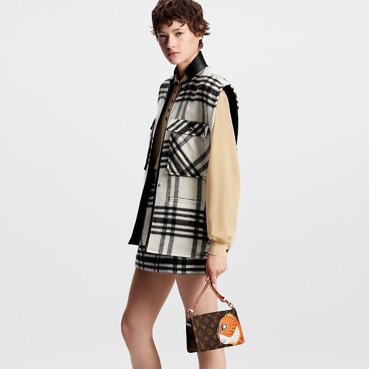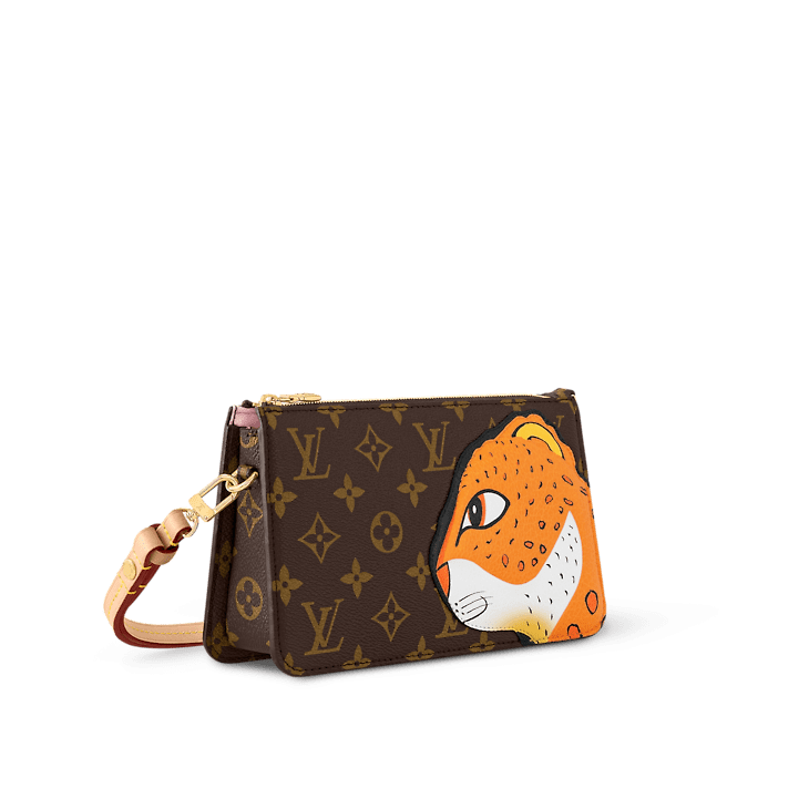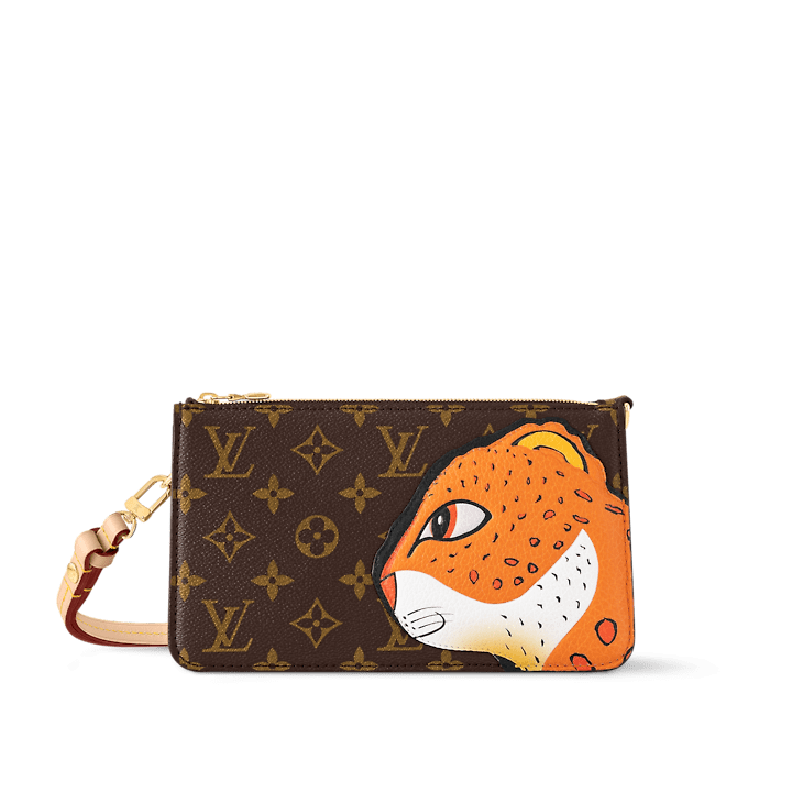 The Lexington pouch in Monogram canvas is revisited for an exclusive collaboration between the artist Sun Yitian and Louis Vuitton Artistic Director Nicolas Ghesquière. This collectible piece features a grained calfskin patch of a leopard, inspired by Sun Yitian's colorful paintings of mass-produced toys. It brings a playful twist to this chic mini-bag, which comes with an orange lining, relying on the background of the original artwork, and a removable strap in natural leather.
