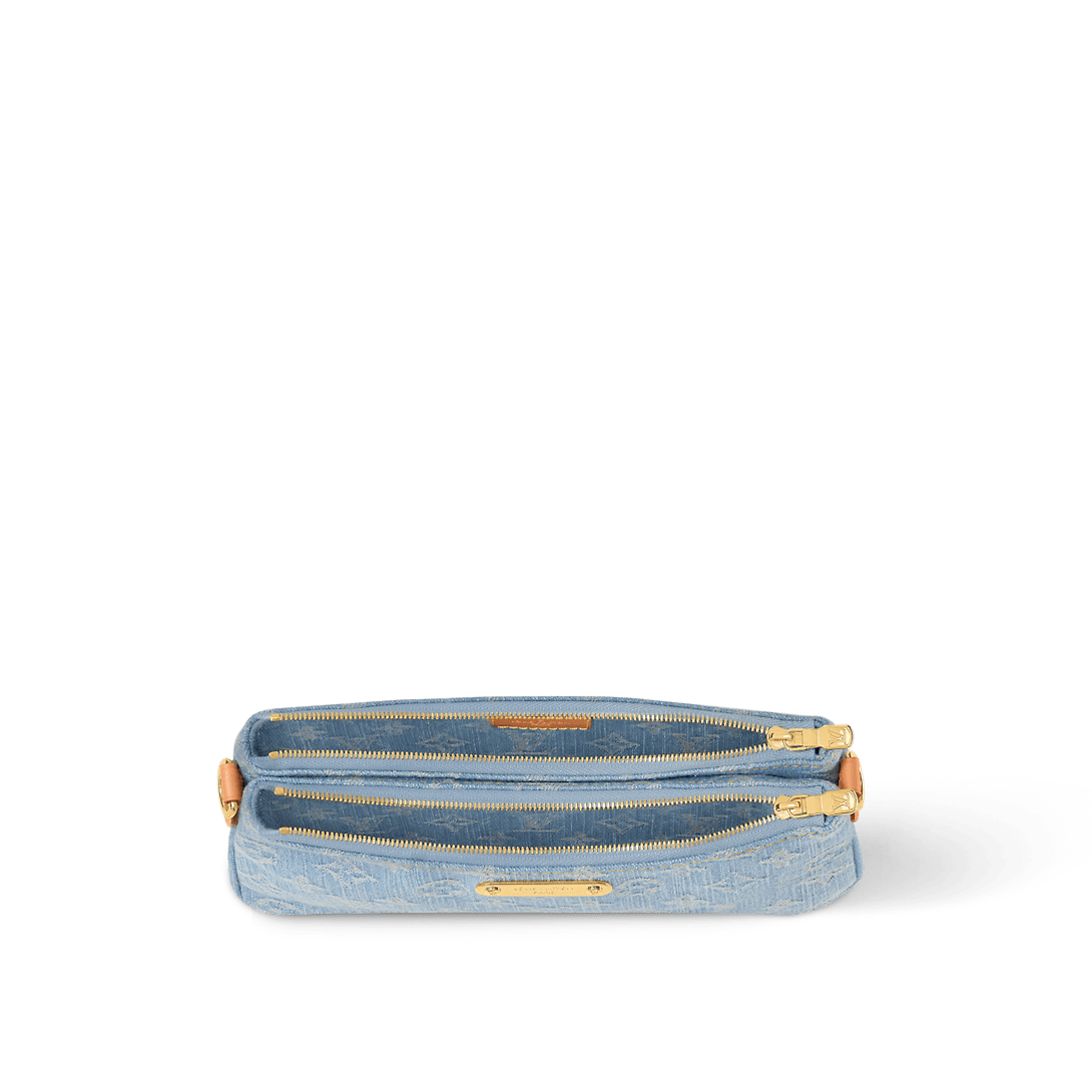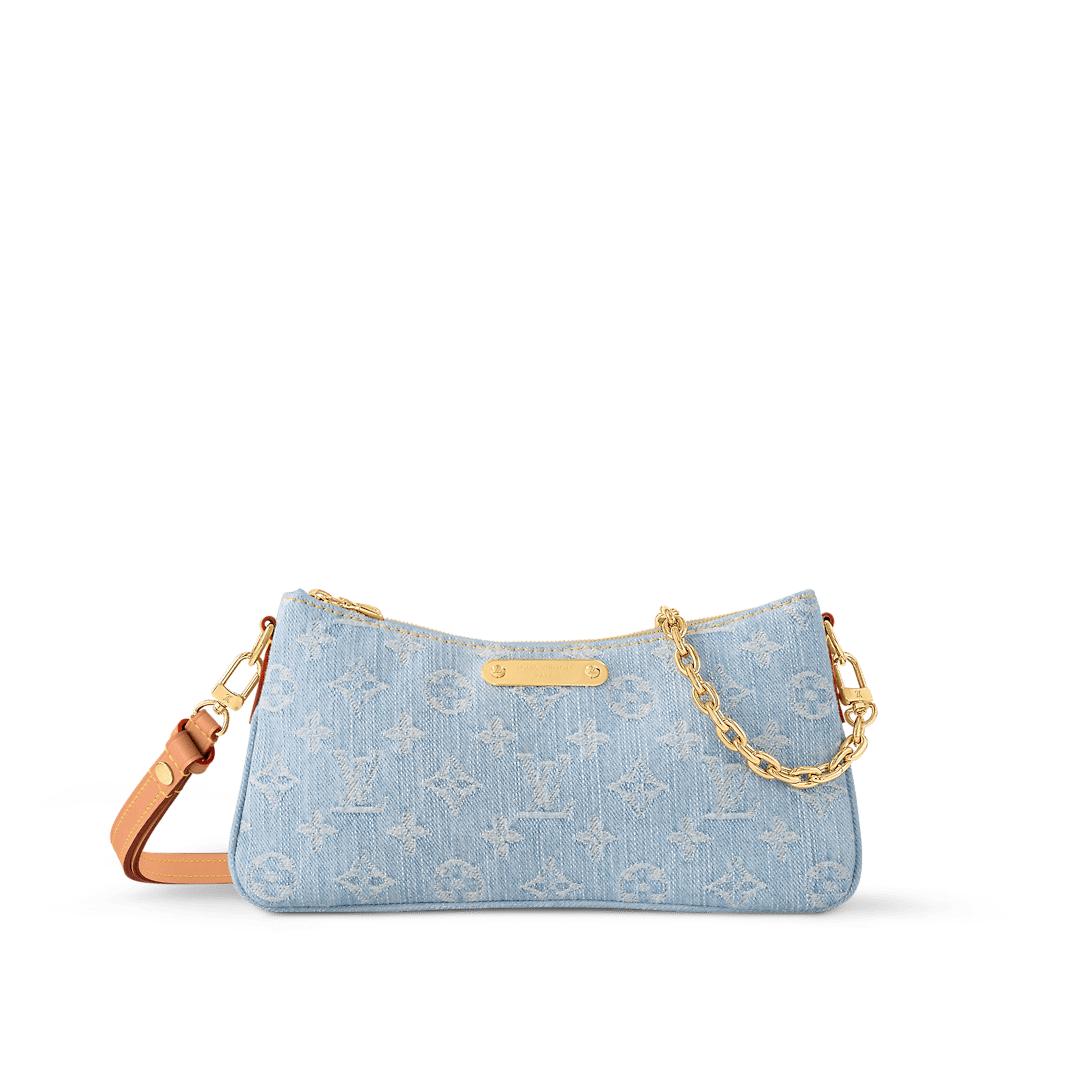 The Liv pochette is revisited in bleached and stonewashed Monogram denim for a vintage look and a summery feel. Designed to sit snugly under the arm, this small bag comes with a removable chain in gold-tone metal and a removable, adjustable strap in aged natural leather. It is signed with a Louis Vuitton-engraved plaque.