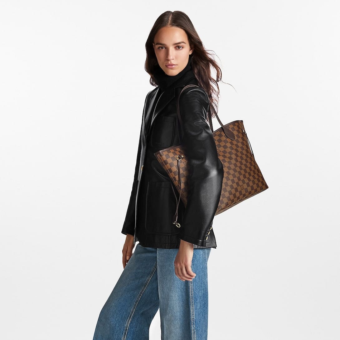 The Neverfull MM tote is made from Monogram Tiles canvas with leather trim along the top of the bag and on the handles. The Monogram pattern has a watercolor aspect and features the LV Circle in the center. It comes with a zipped pouch, with a complementary print, that can be removed and used separately.