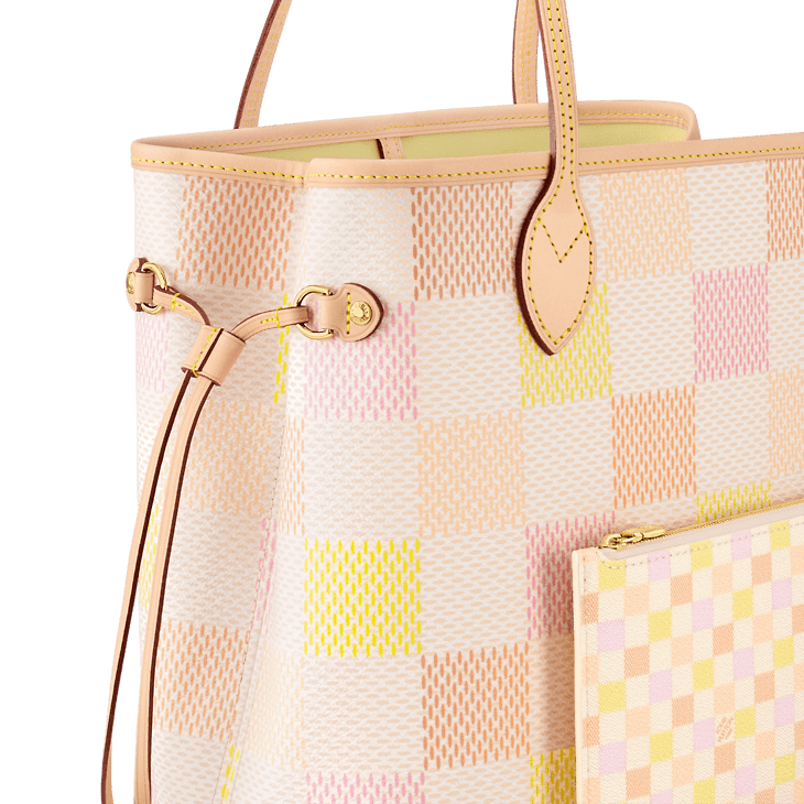 The Neverfull MM tote is made from Monogram Tiles canvas with leather trim along the top of the bag and on the handles. The Monogram pattern has a watercolor aspect and features the LV Circle in the center. It comes with a zipped pouch, with a complementary print, that can be removed and used separately.