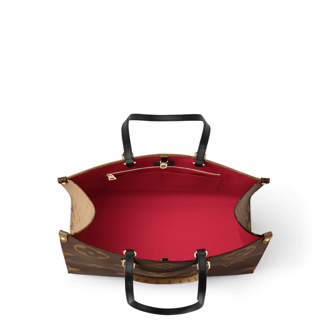 The capacious OnTheGo Voyage tote in Giant Monogram canvas on one side and Monogram Reverse on the other, features a two-in-one bag system: tucked inside the smart interior is a zipped pouch, which can be worn as a belt bag with room for a passport and phone. This stylish carryall perfectly fits the LV Horizon suitcase; and the detachable, adjustable strap enables travelers to breeze along hands-free.