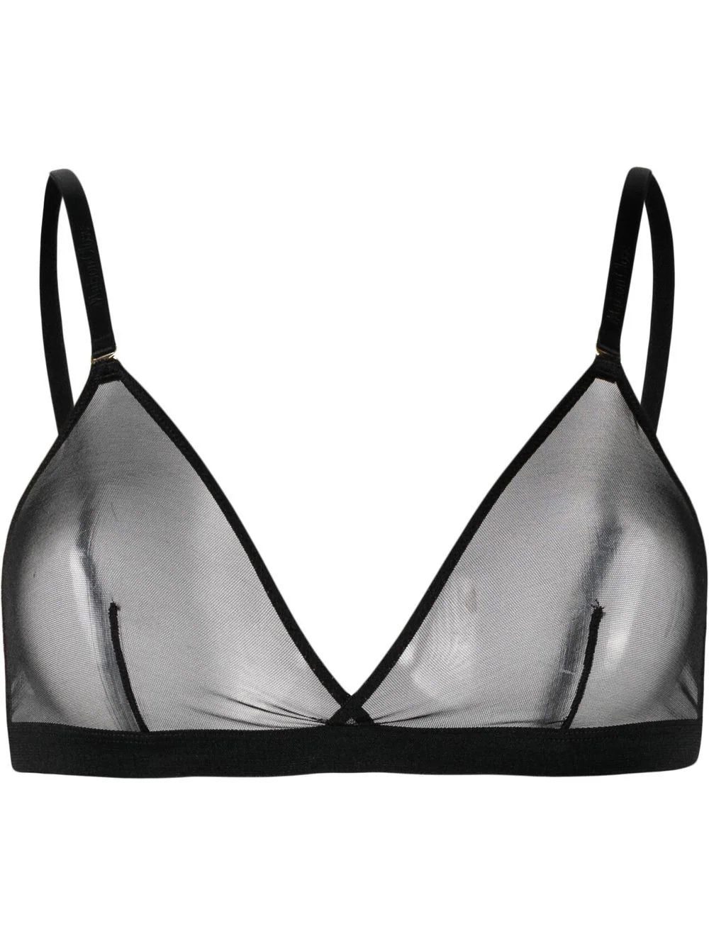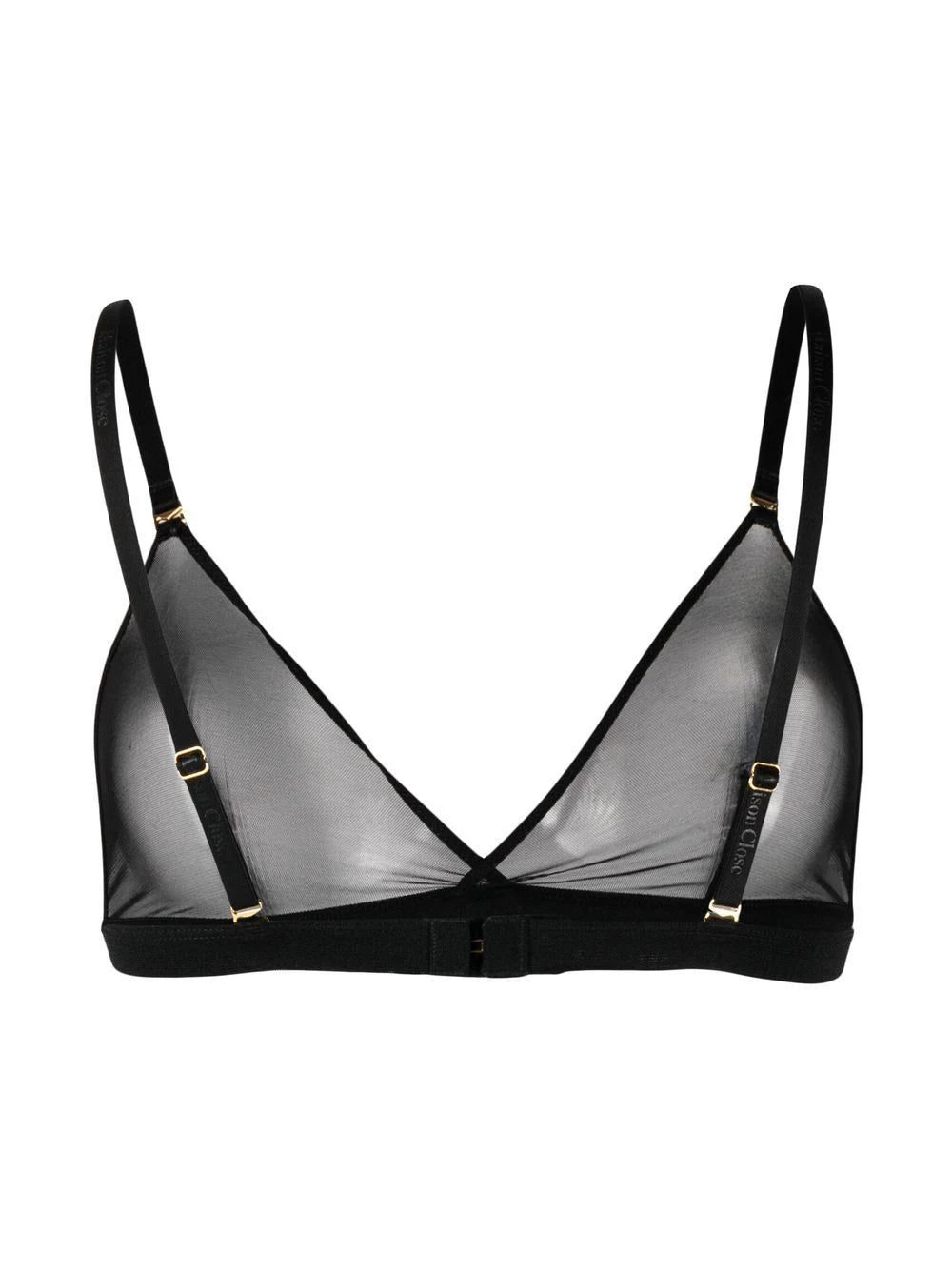 Corps à Corps triangle-cup bra from MAISON CLOSE featuring black, stretch-design, mesh panelling, triangle cup, adjustable spaghetti straps and rear hook fastening.