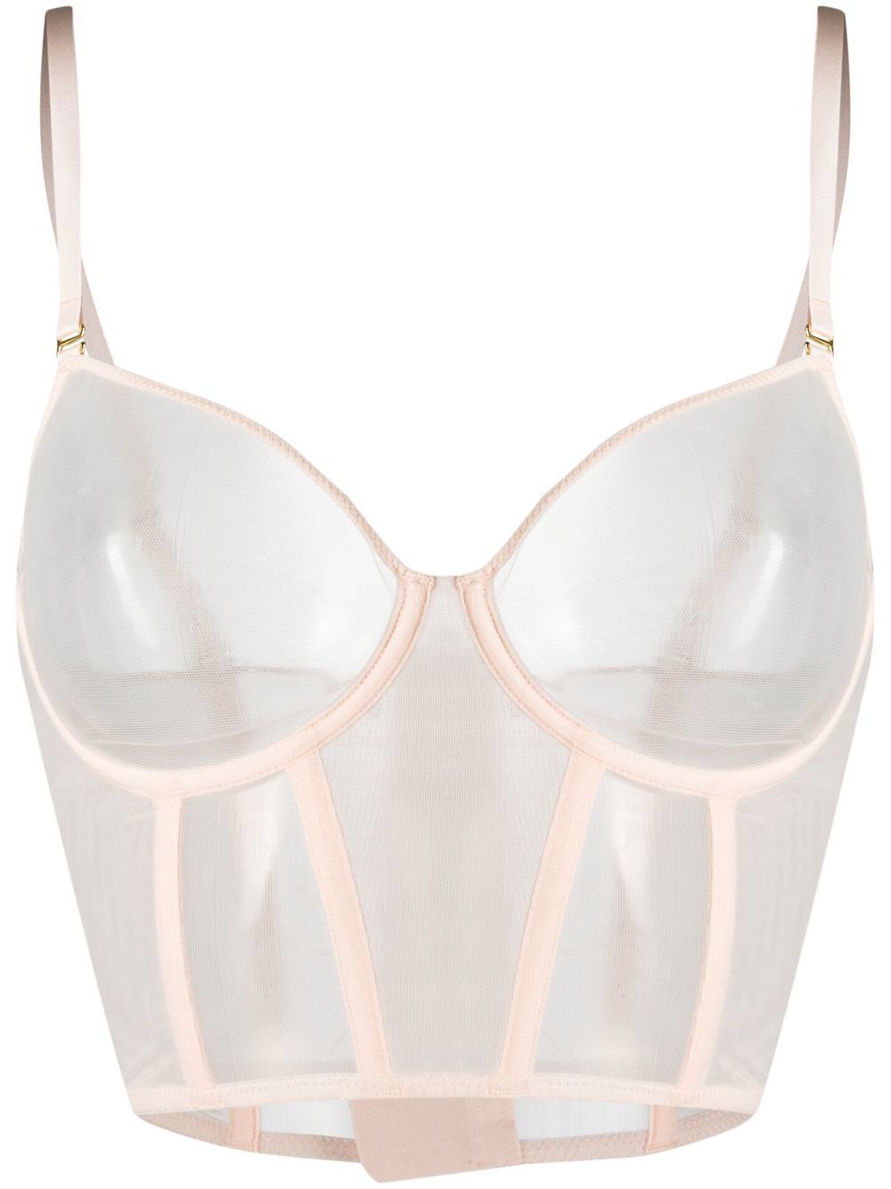 L'Amoureuse Soutien Gorge bustier bra from MAISON CLOSE featuring peony, mesh panelling, sheer, underwire cup, long length, rear hook and eye fastening and adjustable shoulder straps. Just a reminder that this piece must be tried on over your own garments..