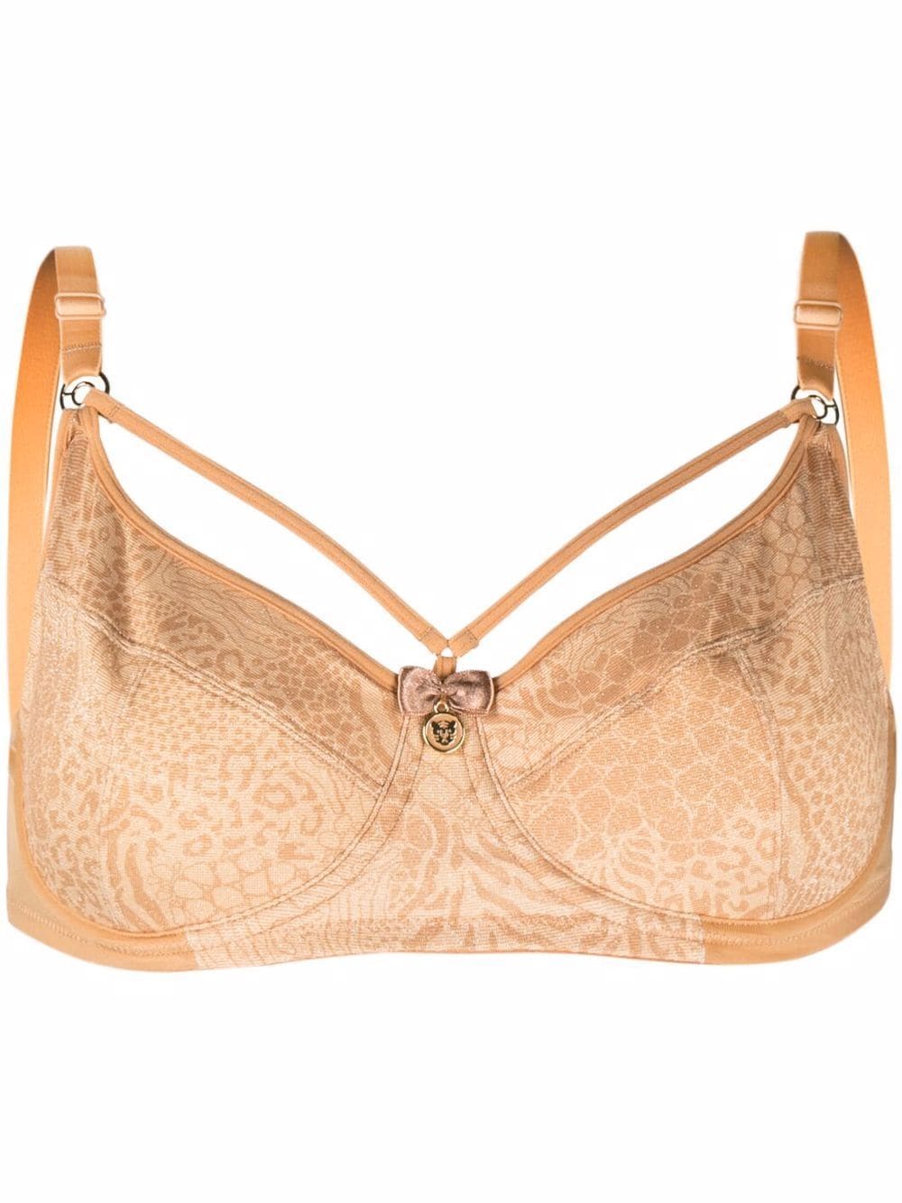 sparkly-mocha animal print metallic threading crossover strap detail unlined underwire cup adjustable spaghetti straps rear clasp fastening Just a reminder that this piece must be tried on over your own garments. POSITIVELY CONSCIOUS: We've partnered with Good On You — an ethical agency that rates how sustainably brands perform across various people, planet and animal welfare criteria. This product comes from a Conscious brand that performs well in relation to their impact on animals.