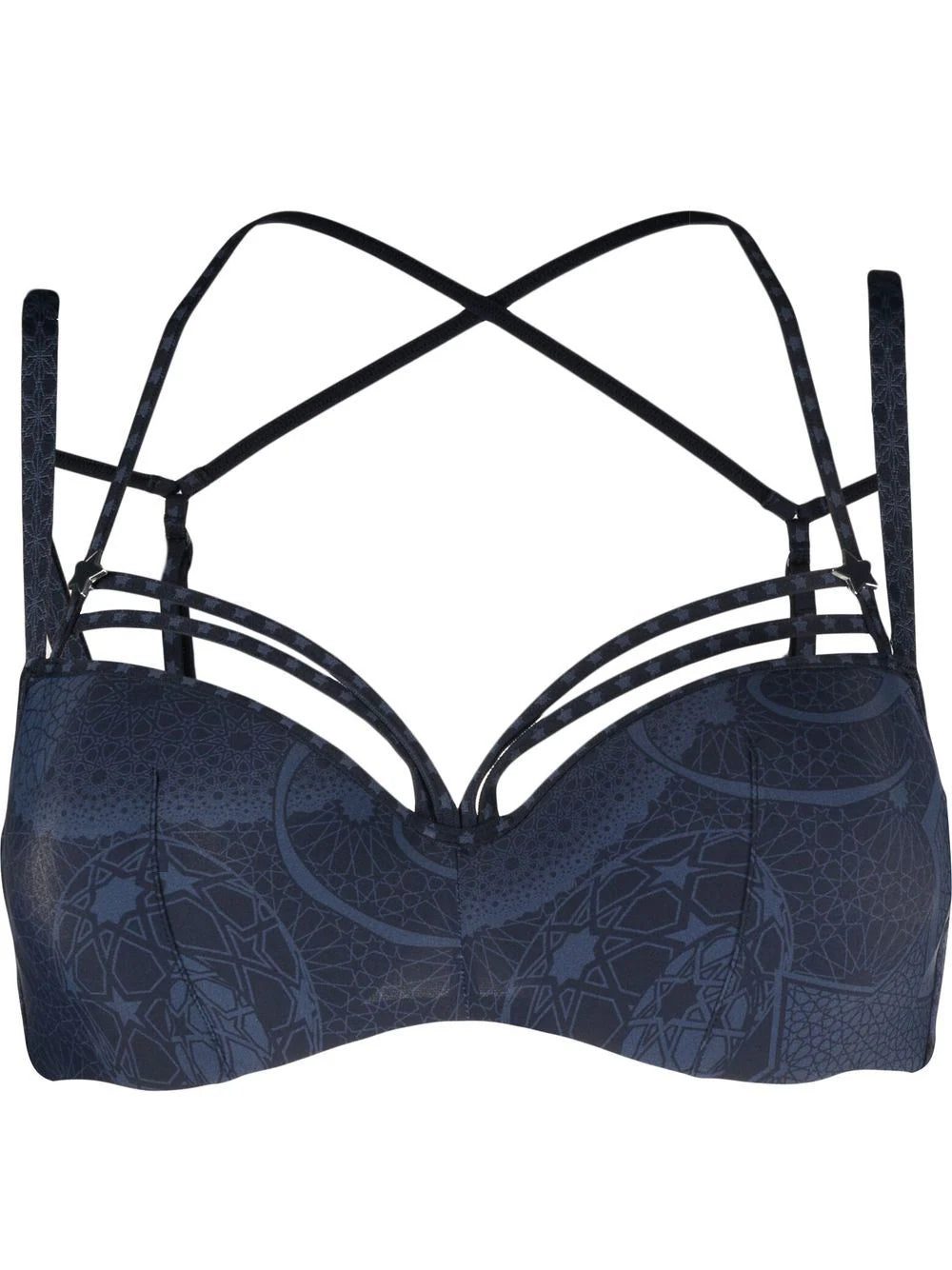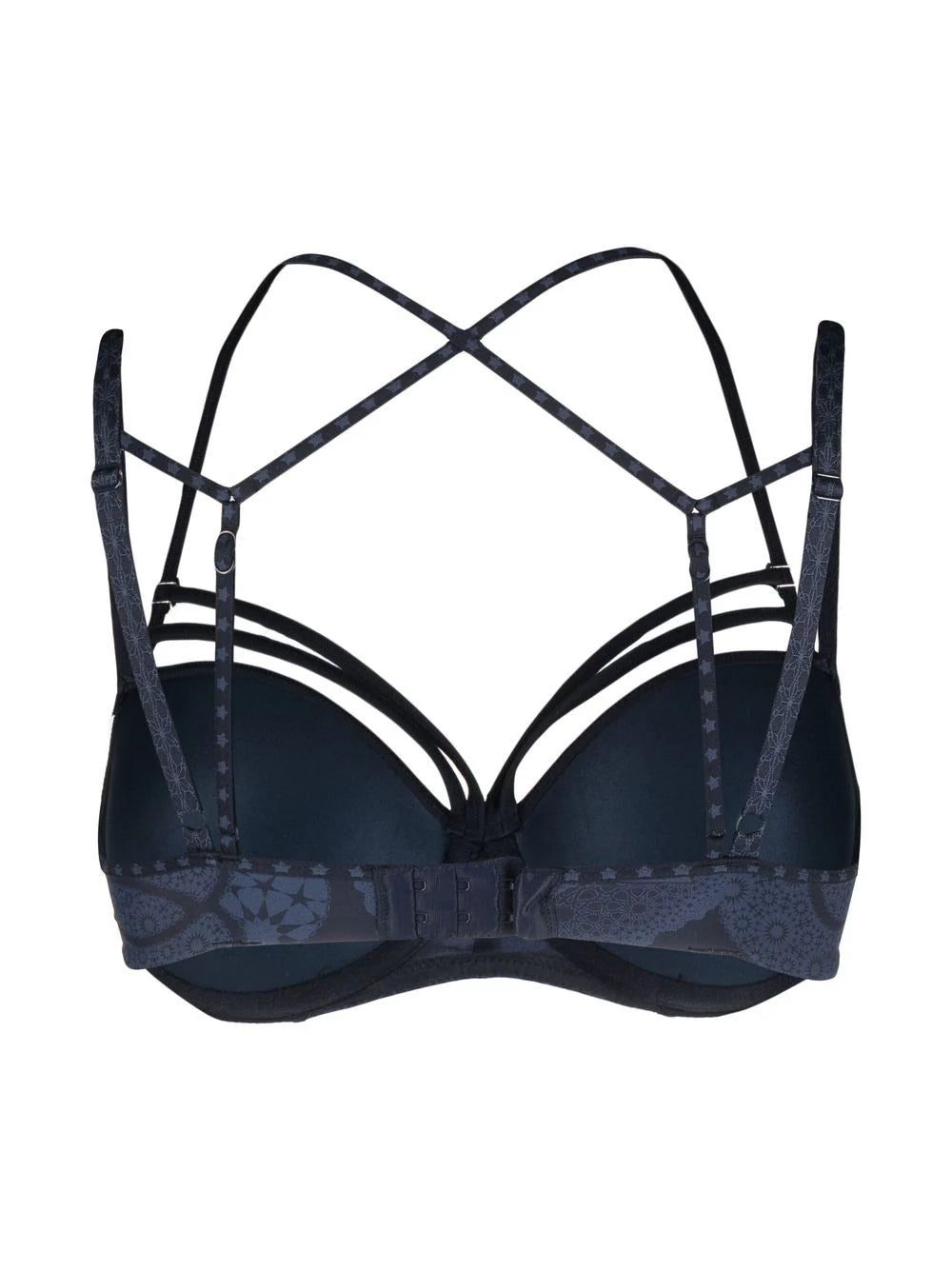padded plunge bra from MARLIES DEKKERS featuring navy blue, recycled nylon, embroidered design, padded design, plunge style and adjustable shoulder straps. POSITIVELY CONSCIOUS: This Planet Conscious product is crafted from certified recycled or upcycled materials, which helps you make a better choice for the environment as they generate less energy, save water and reduce the need for new raw materials. For recycled synthetic clothing products we highly recommend using a microfibre-catching washing bag to ensure that no microplastics that can pollute water are released in the process..