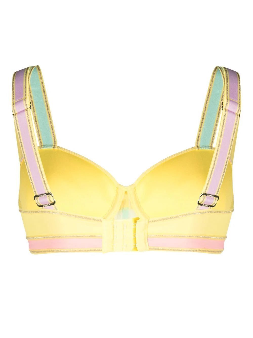 yellow/pink/ice blue recycled nylon blend colour-block design glitter detailing padded design sweetheart neck two adjustable shoulder straps rear hook and eye fastening Just a reminder that this piece must be tried on over your own garments. Conscious: This item is made from at least 50% recycled or upcycled materials. For recycled synthetic clothing products we highly recommend using a microfibre-catching washing bag to ensure that no microplastics that can pollute water are released in the process.