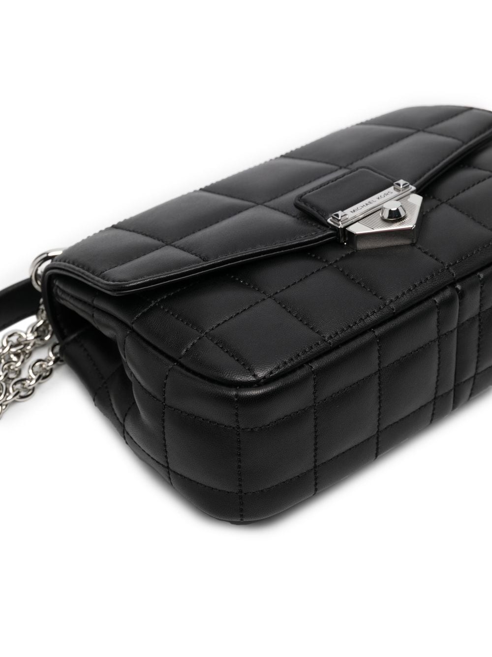 The Michael Kors edit for SS22 includes their signature Soho quilted shoulder bag, which is seen here in a practical black leather construction.Â
