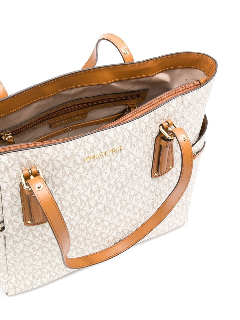 Timelessly elegant and surprisingly affordable, Michael Michael Kors collections capture the effortless, nonchalant finesse of the girl on the go. This beige leather Voyager tote bag features top handles, a front logo plaque, a monogram pattern, an internal zipped pocket, a logo printed lining, an internal slip pocket and an embossed internal logo stamp.