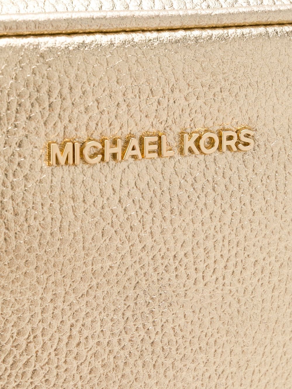 Gold-tone leather Jet Set crossbody bag from Michael Michael Kors featuring a rectangular body, a pebbled leather texture, a top zip closure, a chain and leather strap, gold-tone hardware, a main internal compartment and a hanging tassel.