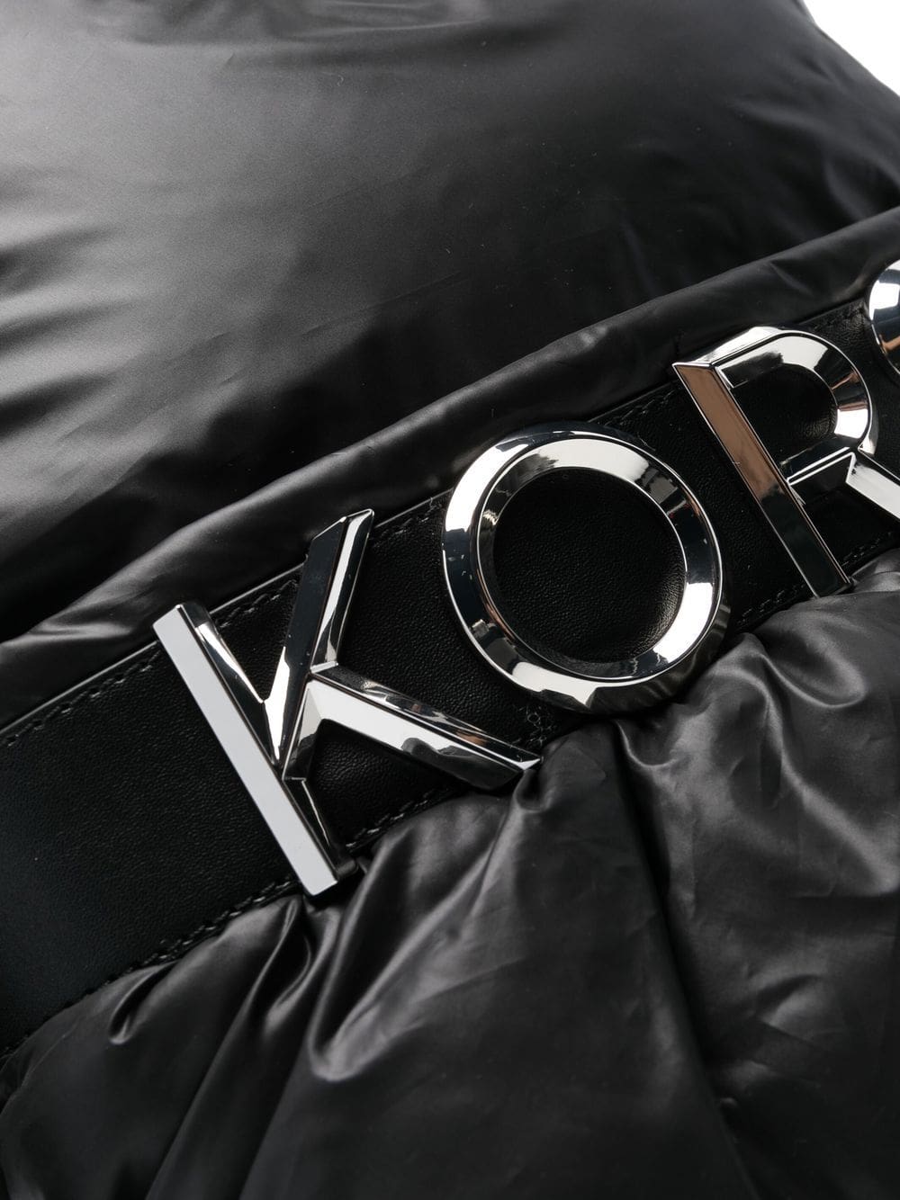 black silver-tone logo lettering quilted finish single top handle two adjustable shoulder straps slip pockets to the sides all-around zip fastening main compartment logo-print lining internal zip-fastening pocket