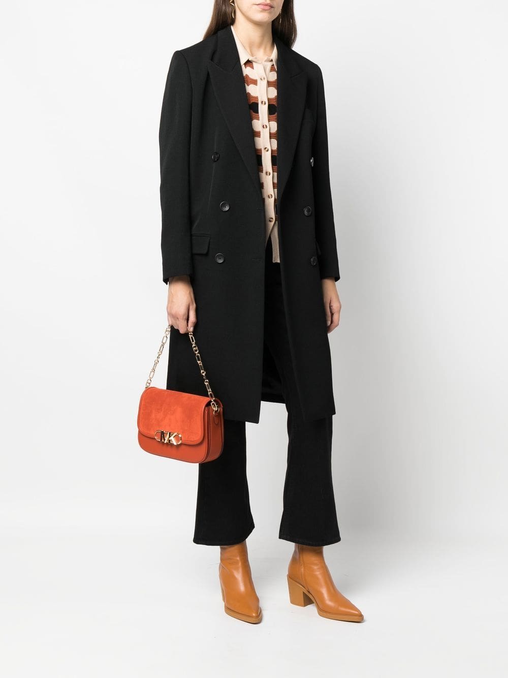 pumpkin orange leather gold-tone logo plaque foldover top with press-stud fastening chain-link shoulder strap detachable shoulder strap
