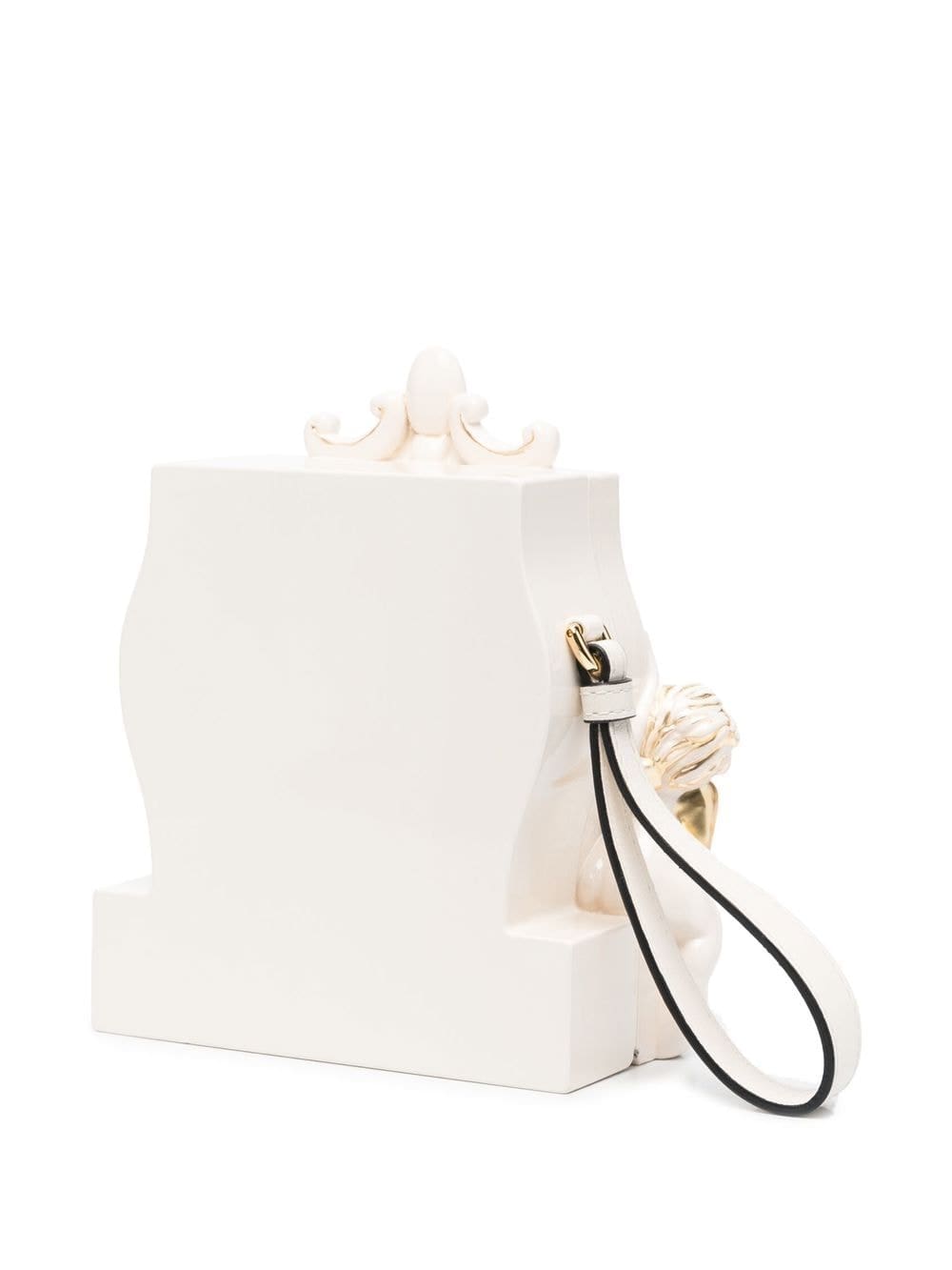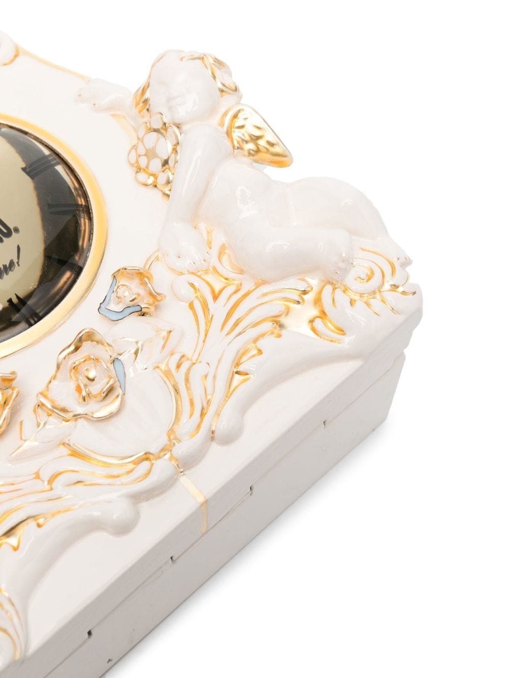 clock sculpted clutch from MOSCHINO featuring off-white, gold-tone, polished finish, wrist strap, top clasp fastening, main compartment and full lining.