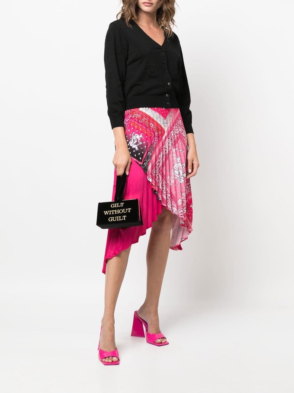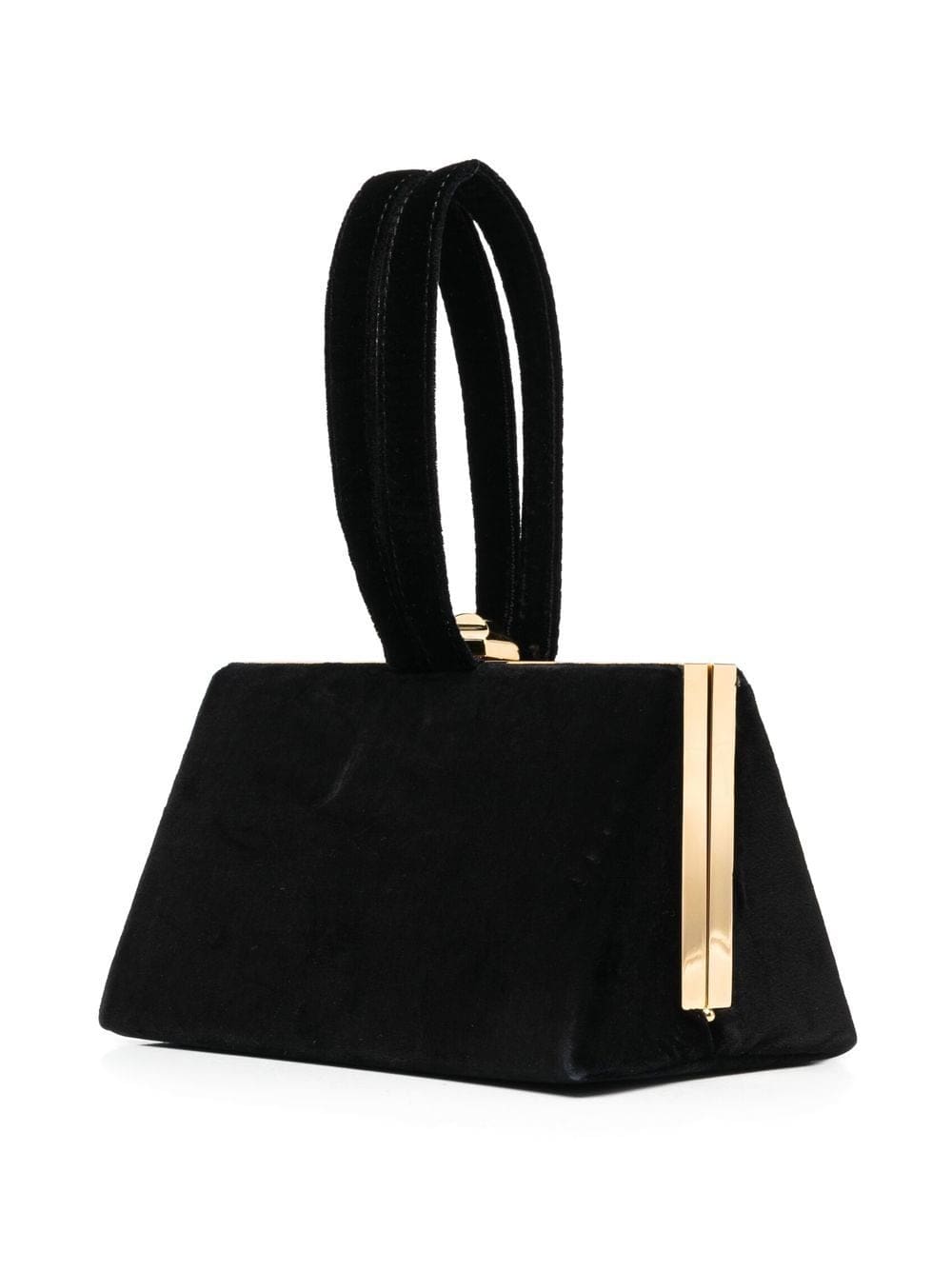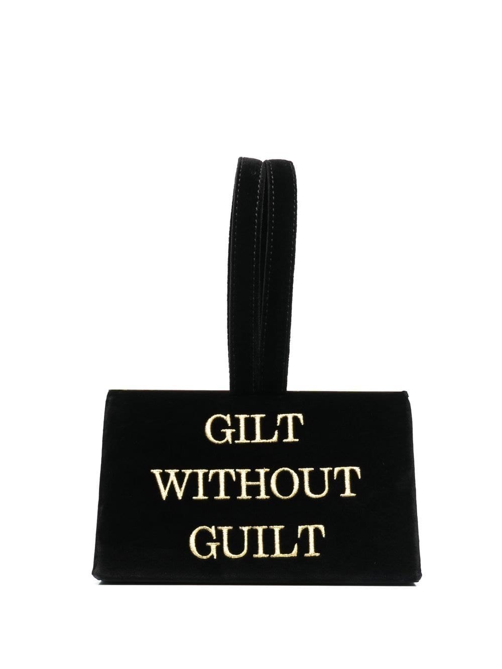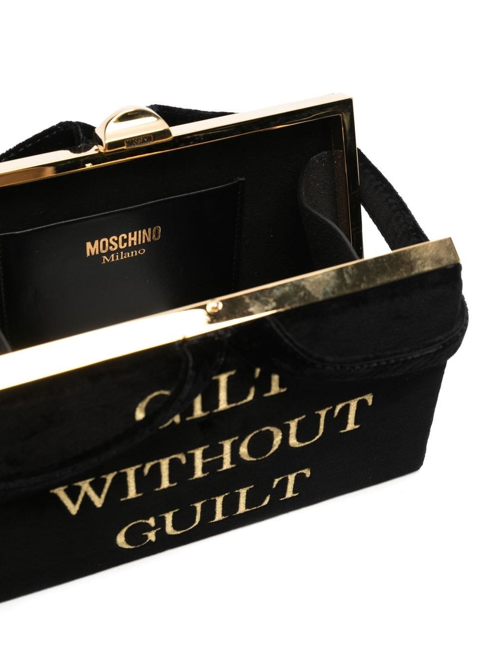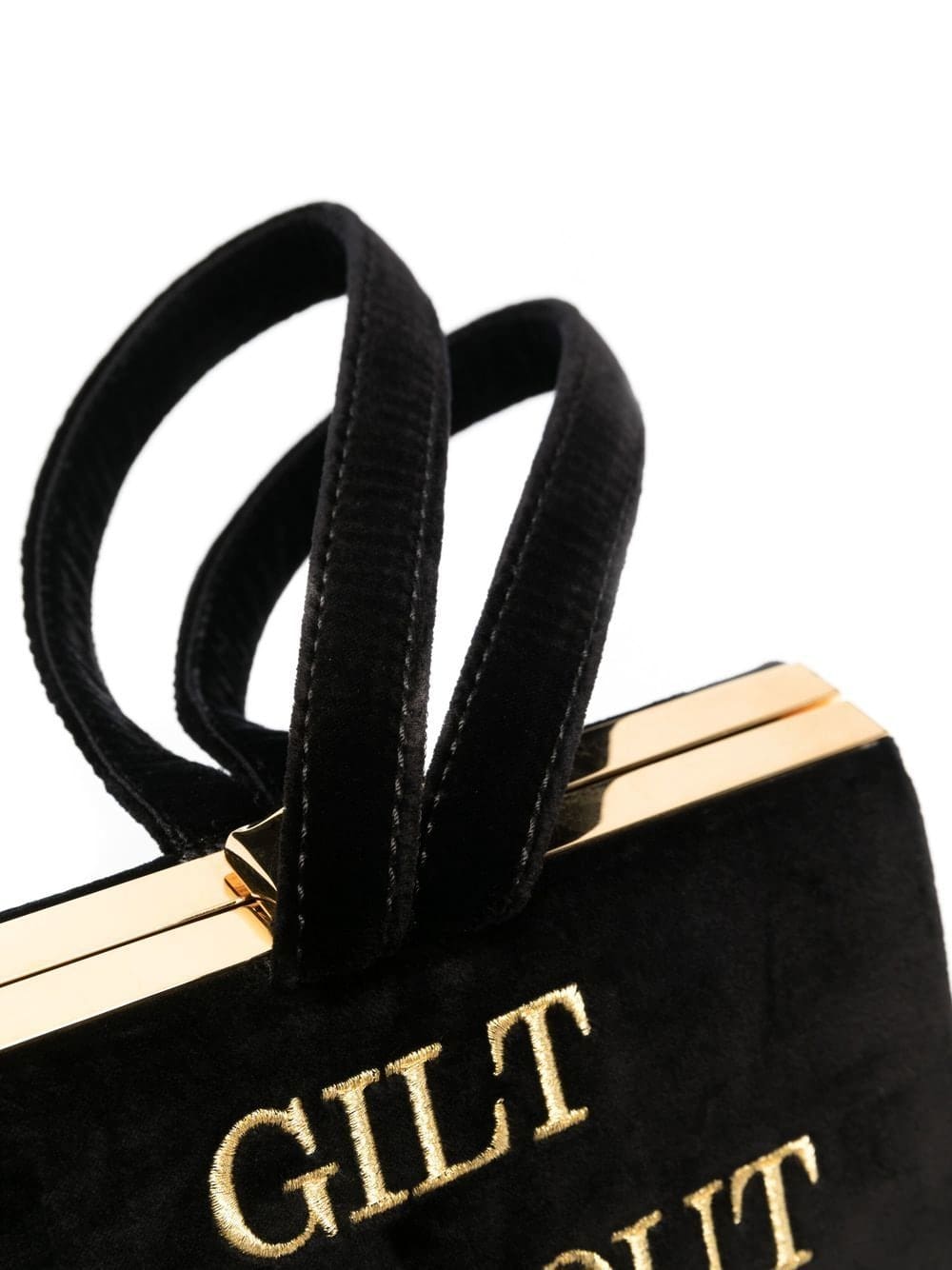 embroidered slogan mini tote from MOSCHINO featuring black, cotton, velvet effect, embroidered slogan, two top handles, top clasp fastening and internal slip pocket.