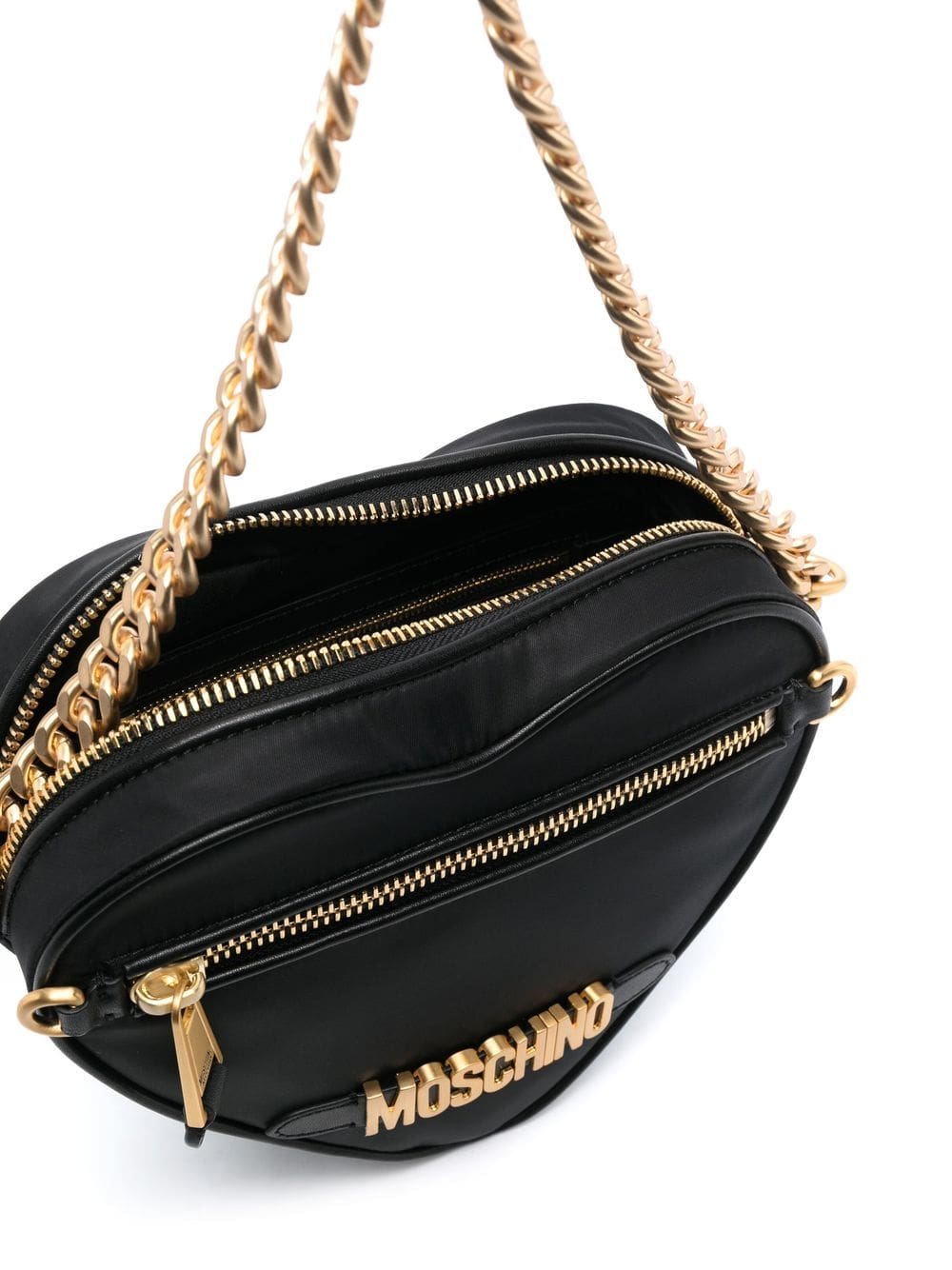 jet black calf leather heart-shaped design gold-tone logo plaque all-around zip fastening front zip-fastening pocket chain-link shoulder strap