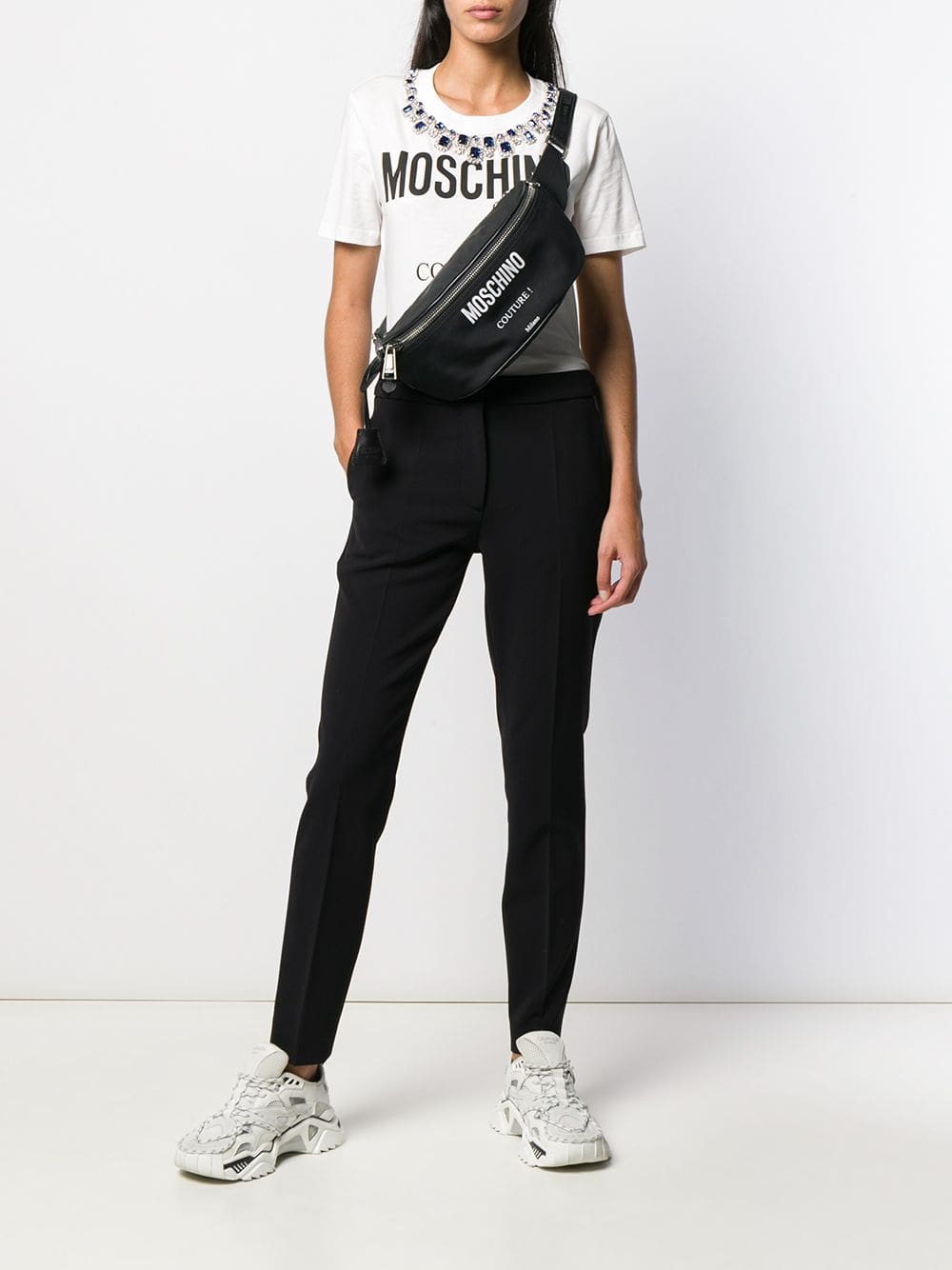 Moschino creates cool pop culture-inspired clothing for the modern streetwear aficionado, as showcased by this black logo print belt bag. Featuring a two way zip fastening, a hanging leather tag, an adjustable fit, a back zip pocket, a main internal compartment and an internal zipped pocket.