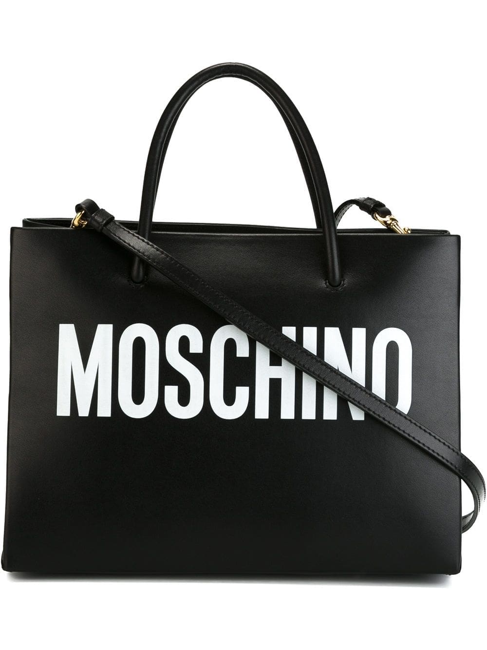 Black and white vinyl Logo print square tote from Moschino featuring round top handles, an open top design, an internal zipped pocket, a detachable shoulder strap and gold-tone hardware.