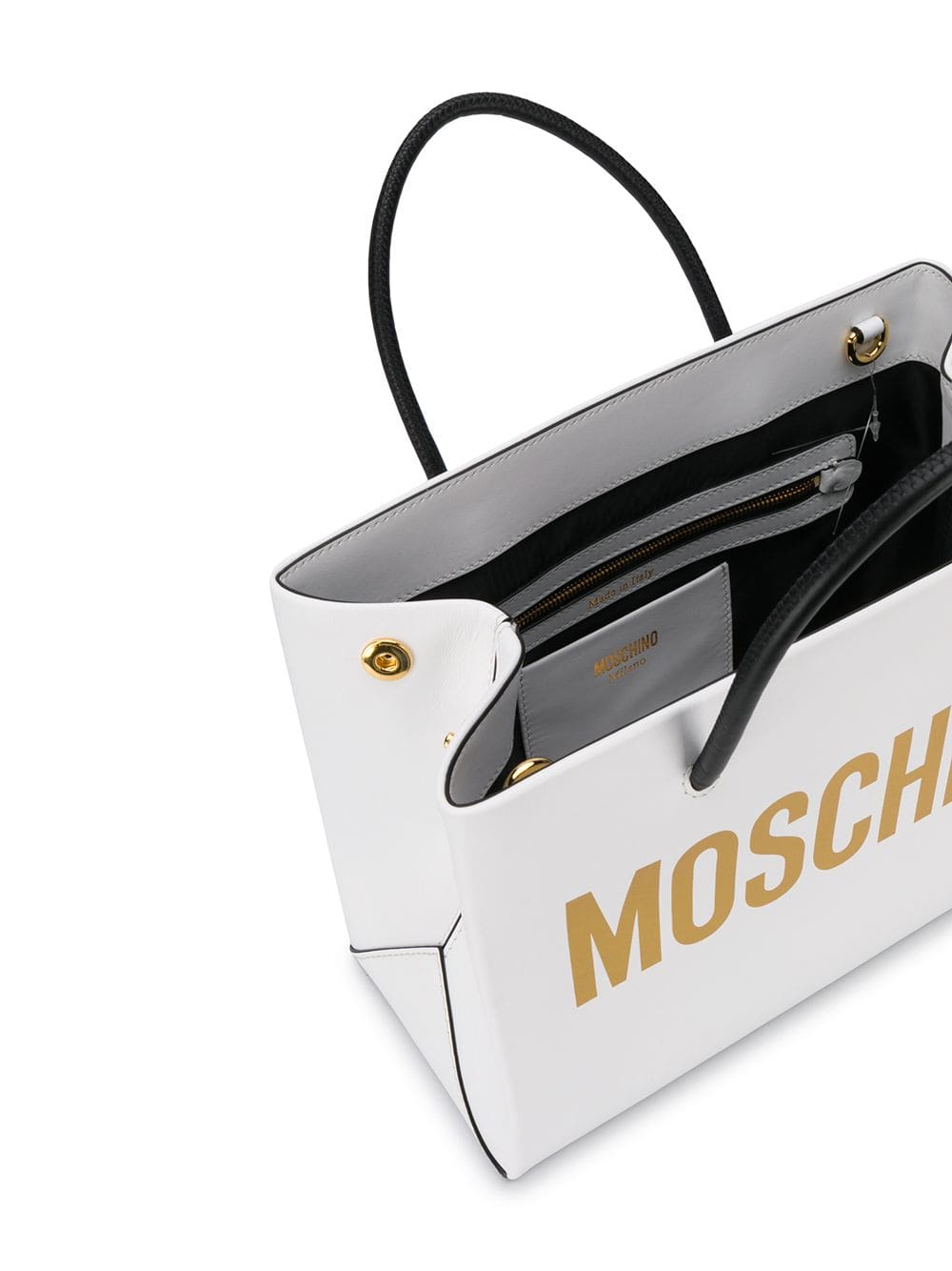 Whether you're going for a casual or classic look, this white calf leather square logo print tote bag from Moschino will be an instant style upgrade. Versatile and super stylish. A great every day tote!