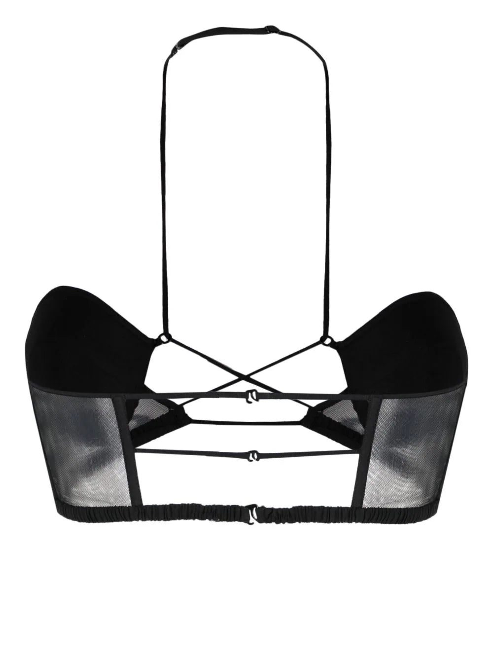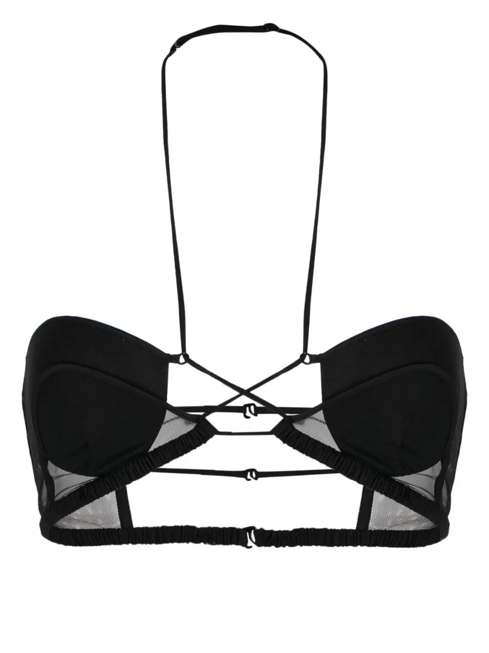 Albanian-born designer Nensi Dojaka pushes the boundaries of conventional lingerie. Crafted from black stretch-virgin wool, this halterneck bra is characterised by connecting spaghettis straps and sheer tulle panelling for a minimal yet striking look.