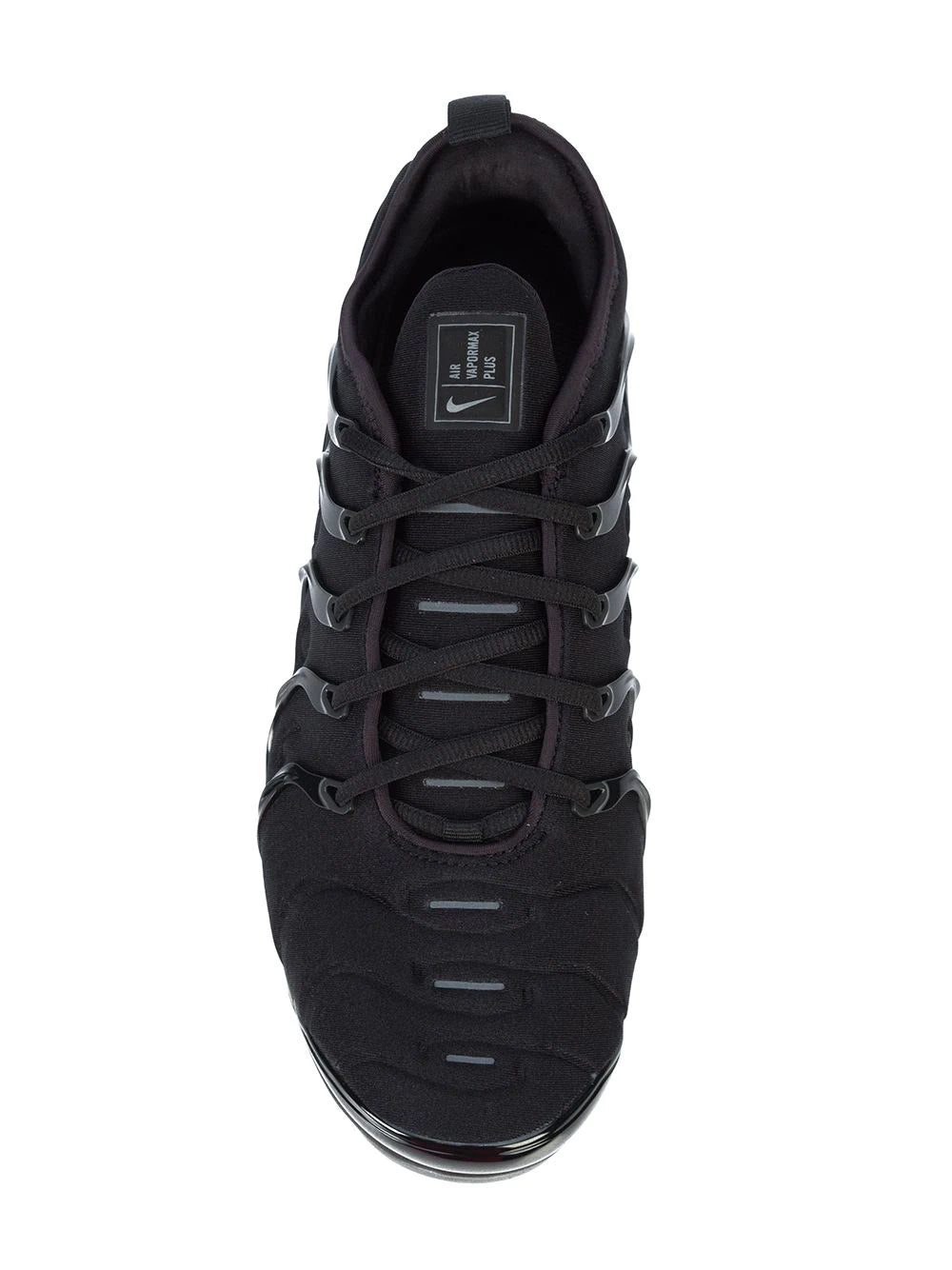 Black cotton Air VaporMax Plus lace-up sneakers from Nike featuring a logo patch at the tongue, a round toe, a lace-up front fastening and a ridged rubber sole. Please note this item is unisex and sold in men's sizing.