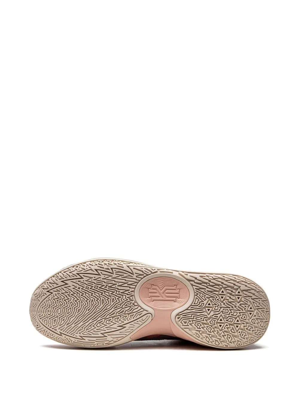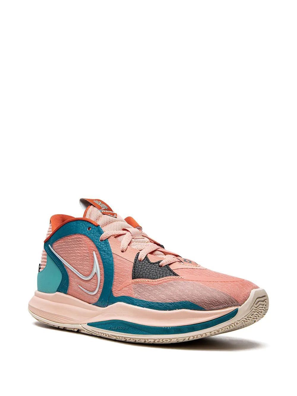 Nike's Kyrie Low 5 now appears in a terracotta and teal colourway. This pair is more lightweight than the last models; it features compressed soles, sleeker ankles, and less bulk. A pop of dark brown leather can be found at eye stays, and pearly-iridescent Swooshes sit at the profile to complete the design.