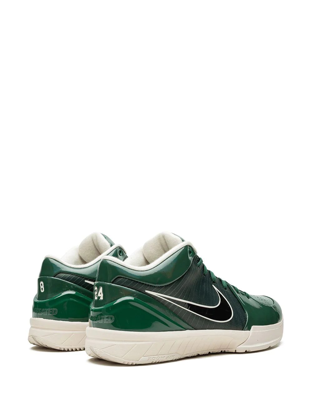 Supplied by a premier sneaker marketplace dealing with unworn, already sold out, in demand rarities. Each product is rigorously inspected by experienced experts guaranteeing authenticity. The Undefeated x Nike Zoom Kobe 4 Protro PE “Milwaukee Bucks” is the player exclusive colorway for Giannis Antetokoumpo that was released in the collaboration between the LA-based boutique and Nike on Kobe Bryant’s fourth signature model. The Bucks star, a Team Kobe member prior to receiving his first signature design from Nike, gets laced with a “Fir Green” look dedicated to his team colors. The Giannis Kobe 4 features the dark shade of green across the Flywire mid-panel, patent leather toe and heel, and TPU heel counter. A white outlined black Swoosh appears on the mid-panel with tonal green laces and Nike and Undefeated branding on the tongue. Faint Undefeated branding is located on the heel with Bryant’s former jersey numbers of “8” and “24” sitting just above on the heel. Putting the finishing touches on the silhouette is a cream-colored sole. The Undefeated x Nike Zoom Kobe 4 Protro PE “Bucks” was released on August 24, 2019.