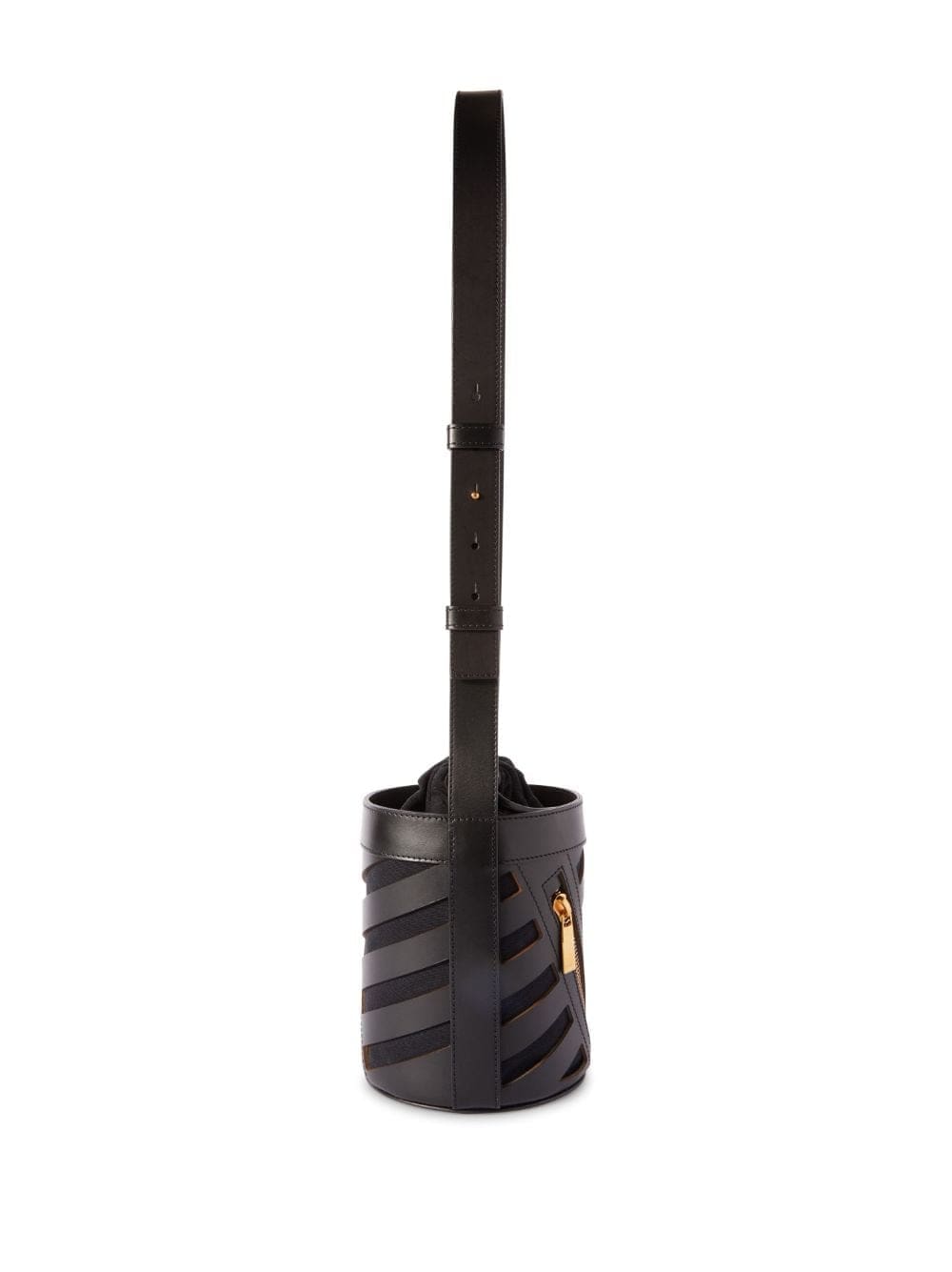 The Diag-print is one of Off-White's most celebrated motifs, appearing throughout the brand's collections. Here it adorns this leather bucket bag, complemented by gold-tone logo lettering for a distinctive finish.