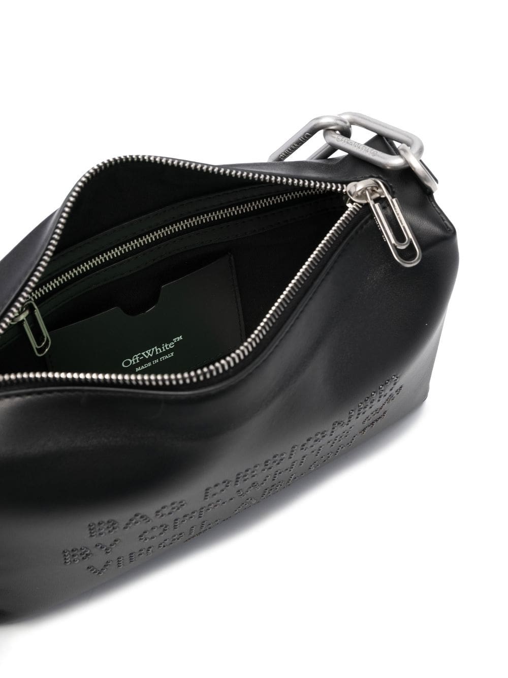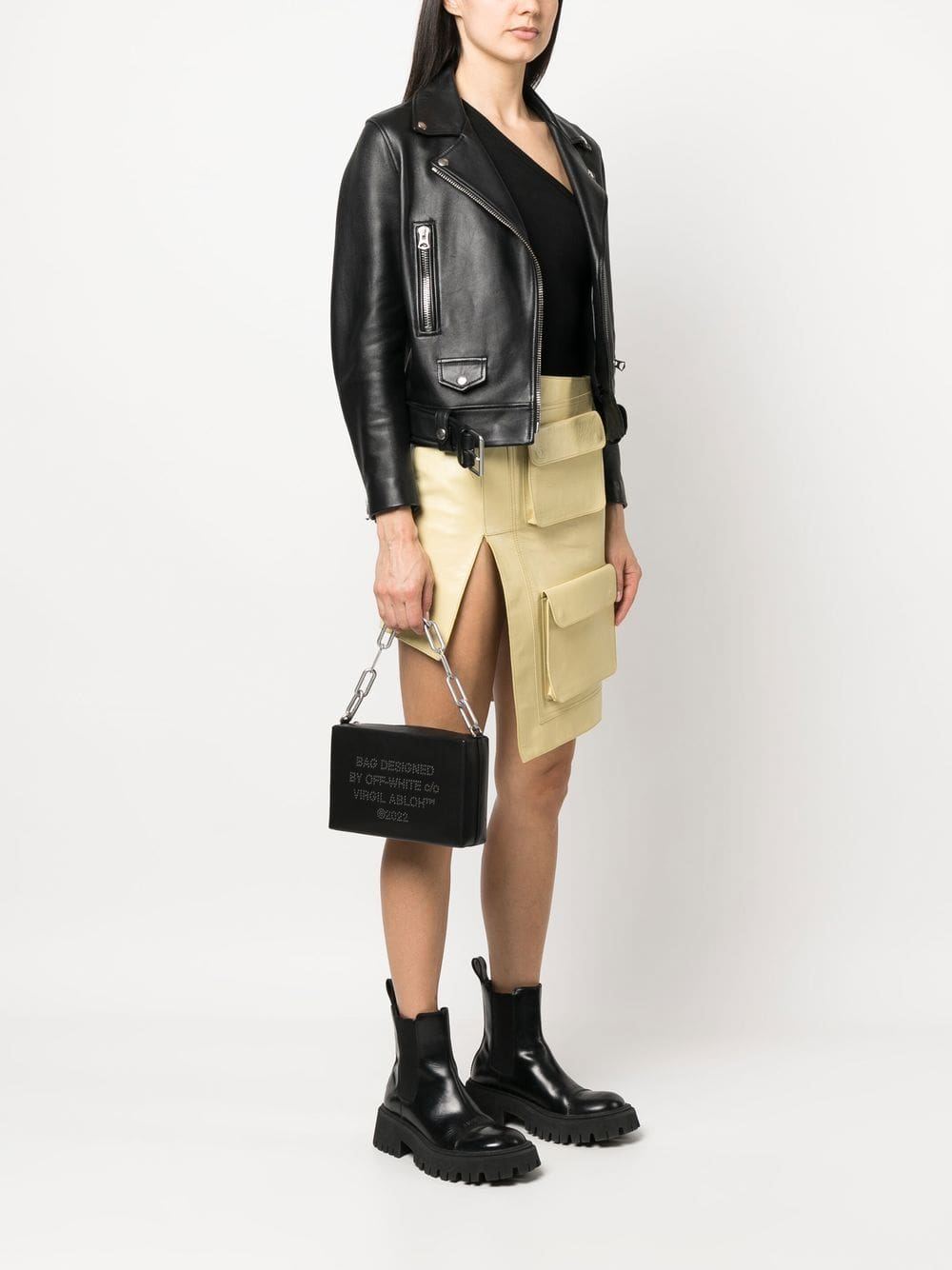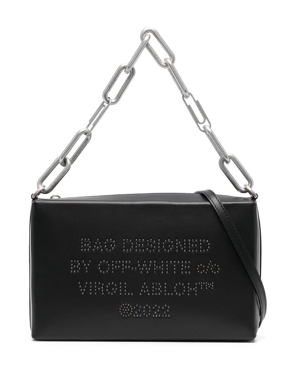 This Off-White shoulder bag channels the brand's contemporary take on accessories. It's crafted from leather to a rectangular shape, fitted with a paperclip-shaped zip pull and elevated by studded logo lettering. A chain shoulder strap comprising engraved silver-tone links completes the design.