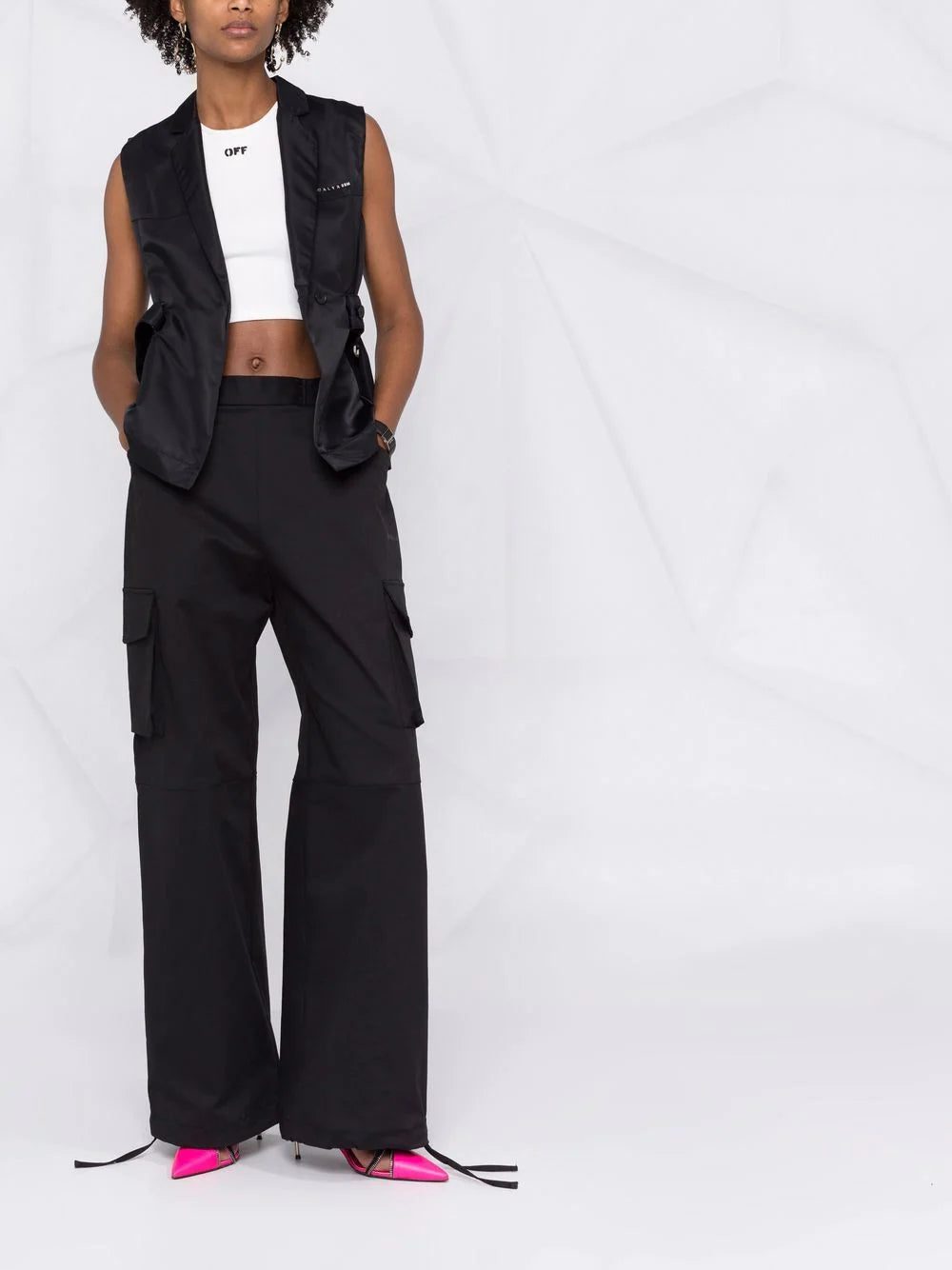 Off-White utilises their signature white and black tones with this sleeveless top. Boasting a cropped construction, the piece features a contrasting logo print to the front.
